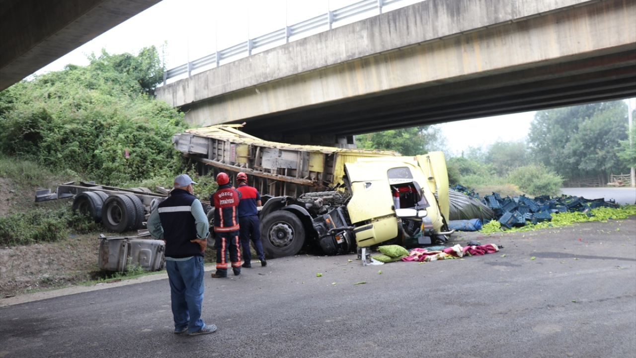 Ekipler devrilen tırda bulunan yaralıları araçtan çıkarak Düzce`deki hastaneye kaldırdı.