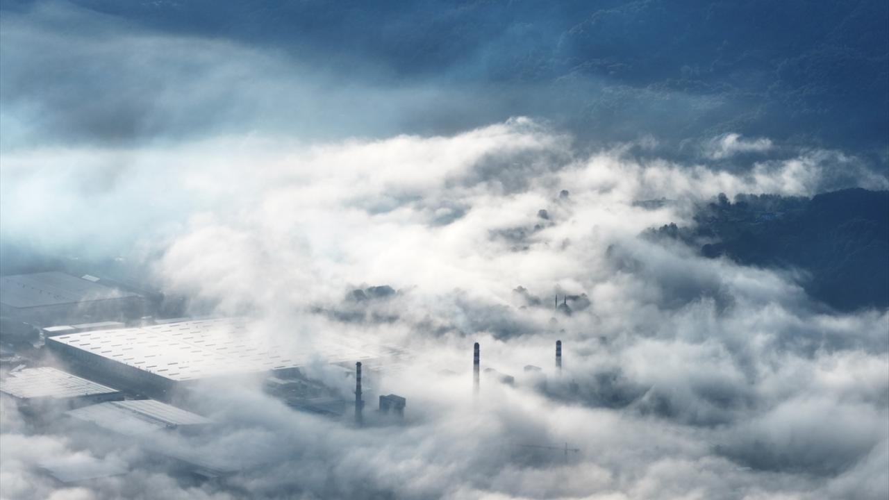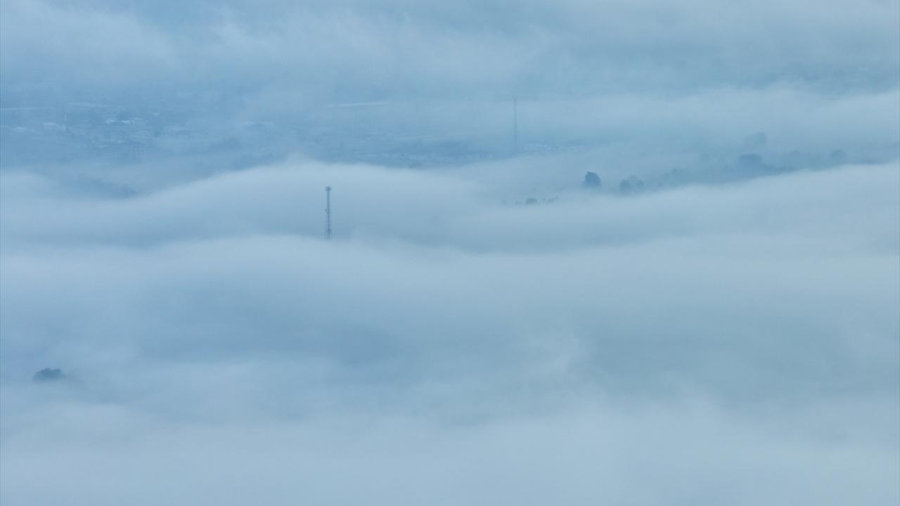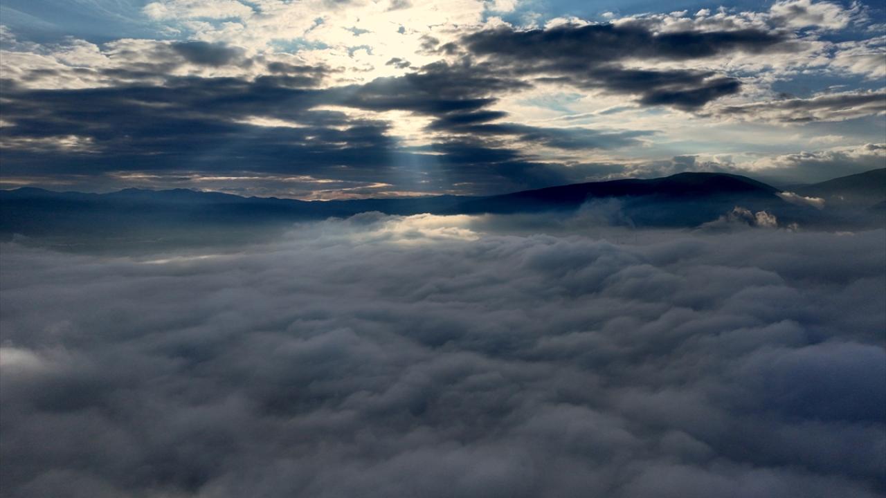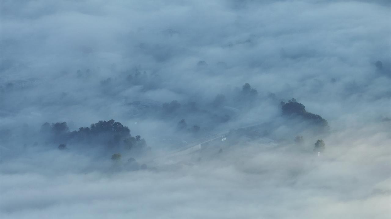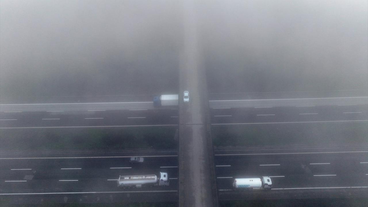 Sis tabakasının kapladığı ova ile sisin etkili olduğu otoyoldaki trafik akışı, havadan görüntülendi.