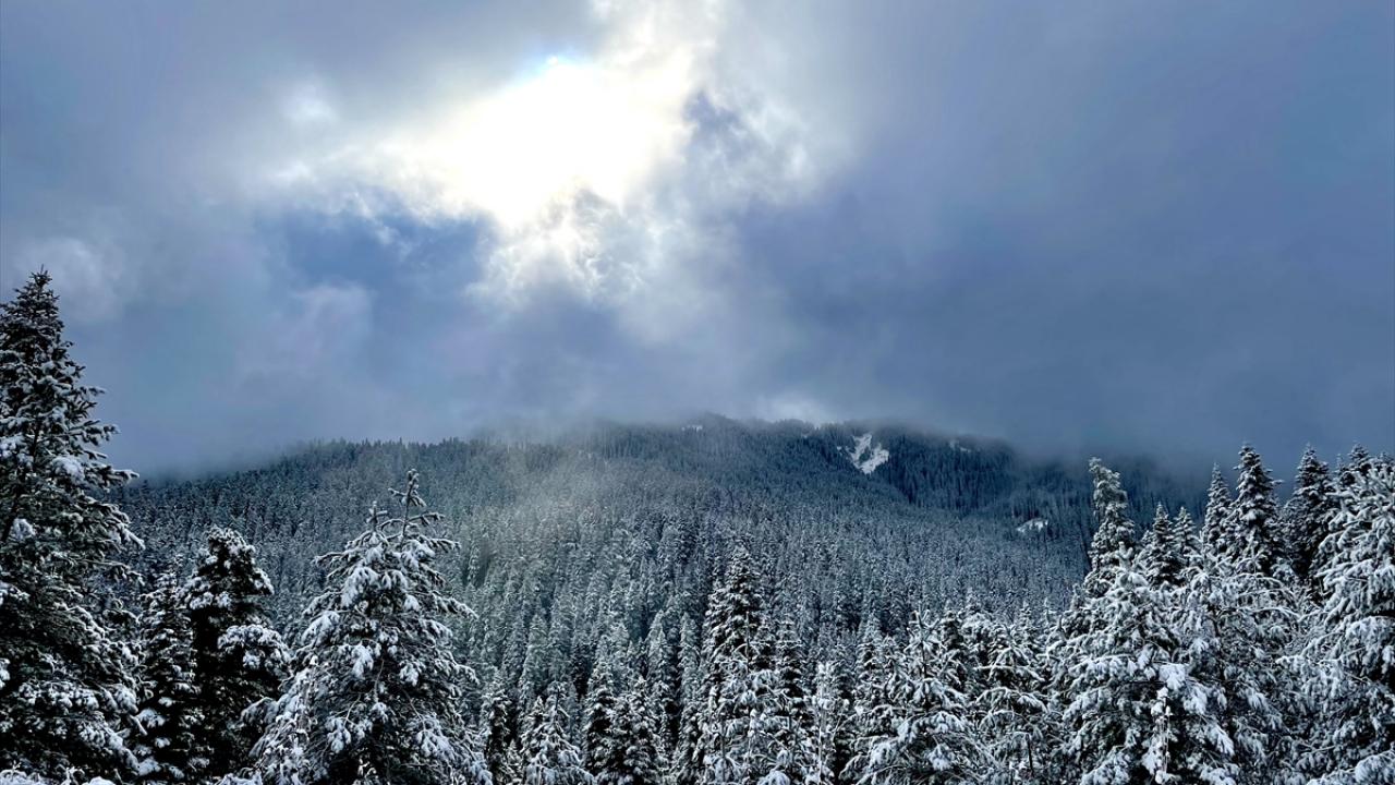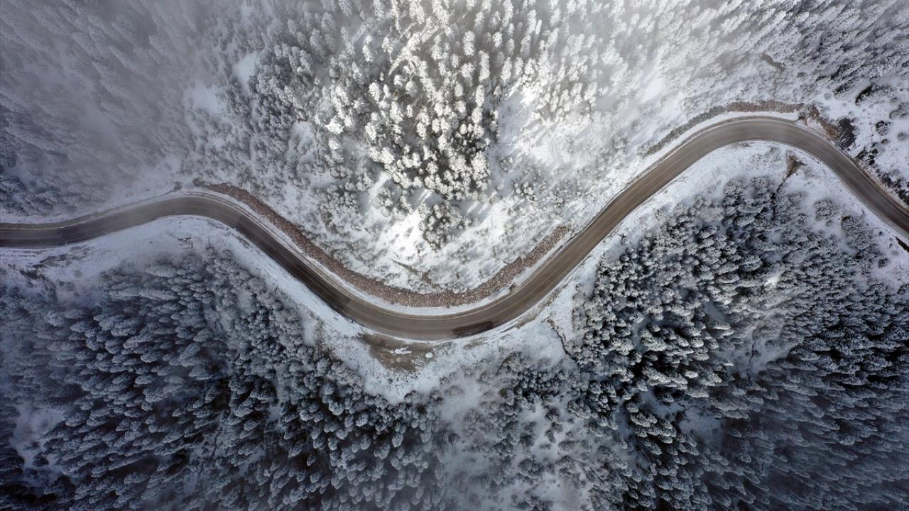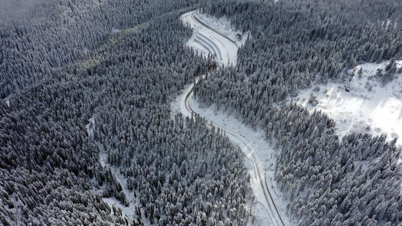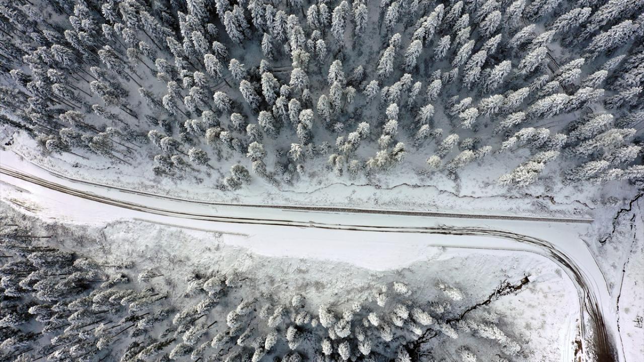 Kar kalınlığının 10 santimetreye yaklaştığı Ilgaz Dağı`ndaki çam ağaçlarının oluşturduğu görsel şölen, dronla görüntülendi.
