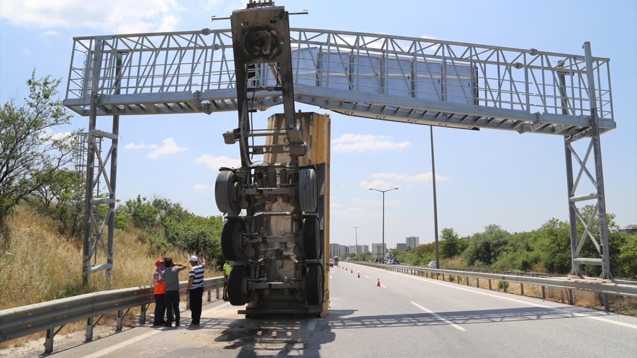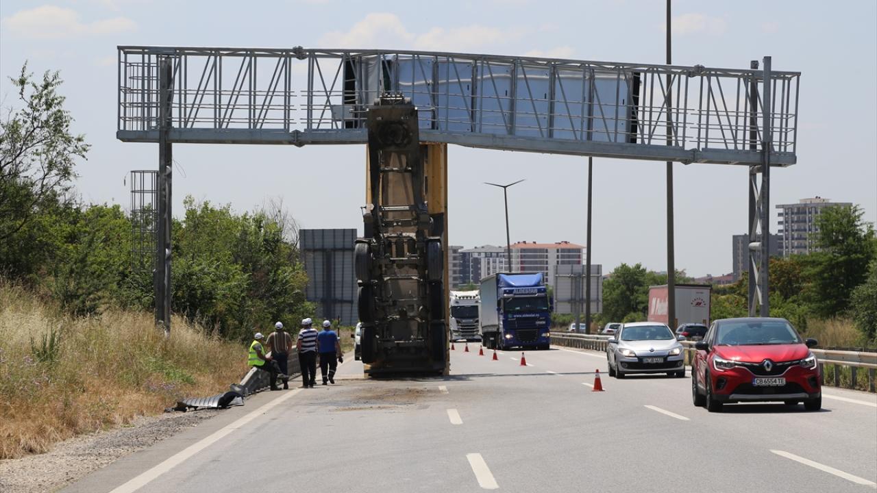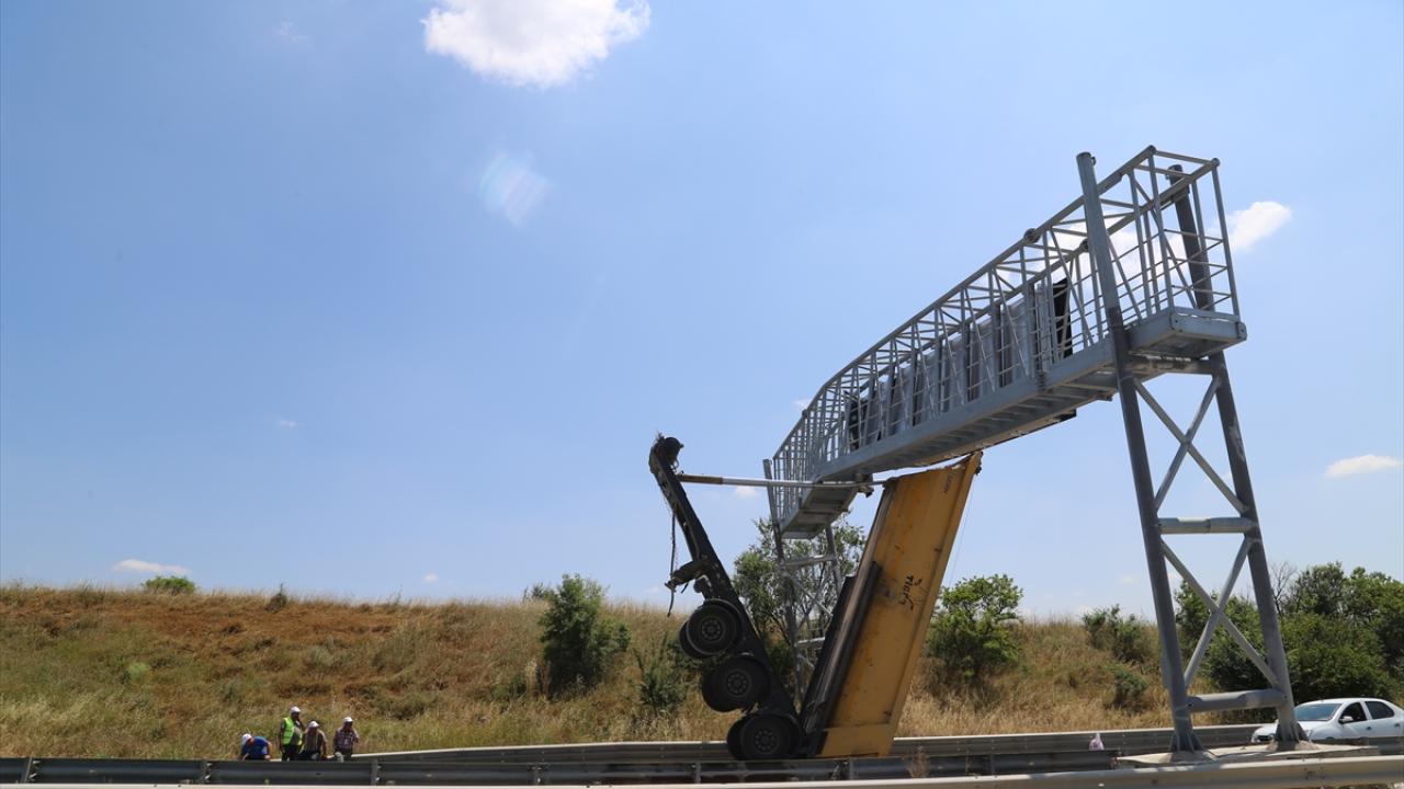 Edirne'de seyir halindeyken damperi açılan tırın dorsesi dijital trafik bilgilendirme panosuna çarptı. Çarpmanın etkisiyle dorseden ayrılan tır yaklaşık 50 metre sonra durabildi.
