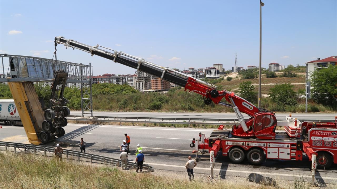 Trafik panosunda hasara neden olan dorse vinç yardımıyla kaldırıldı.