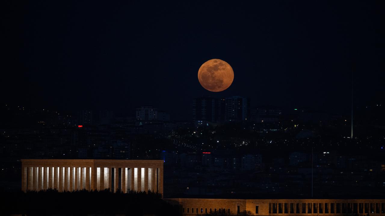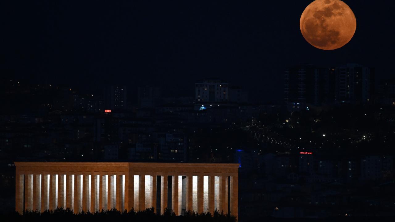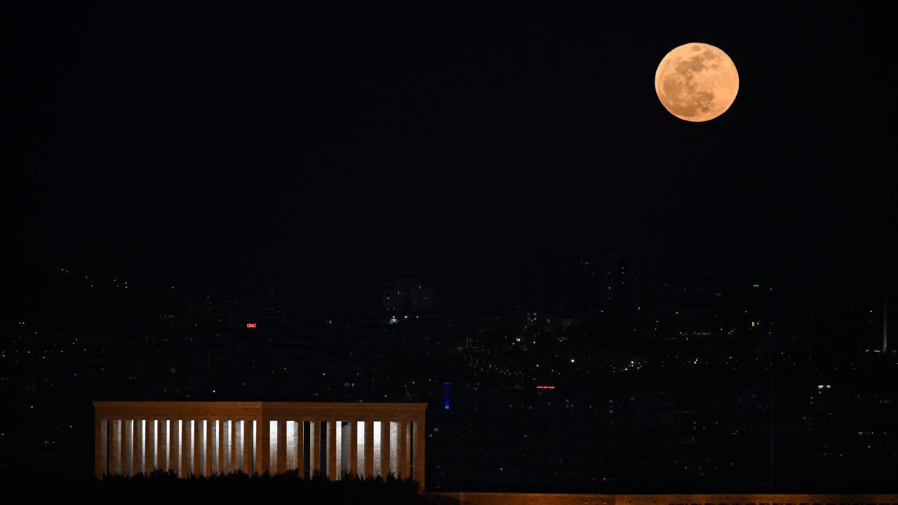 Ankara'da akşam saatlerinde beliren dolunay, Anıtkabir ile güzel görüntü oluşturdu.