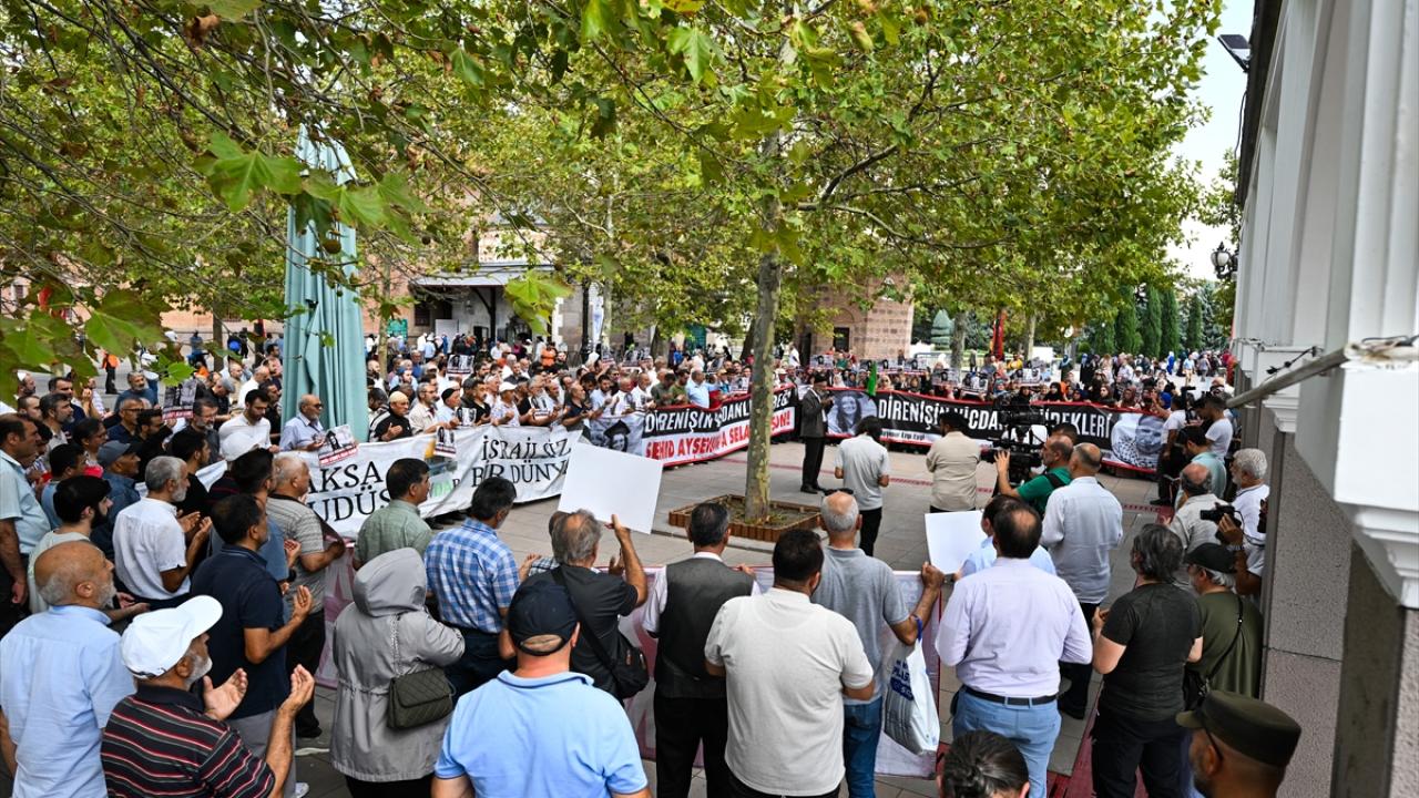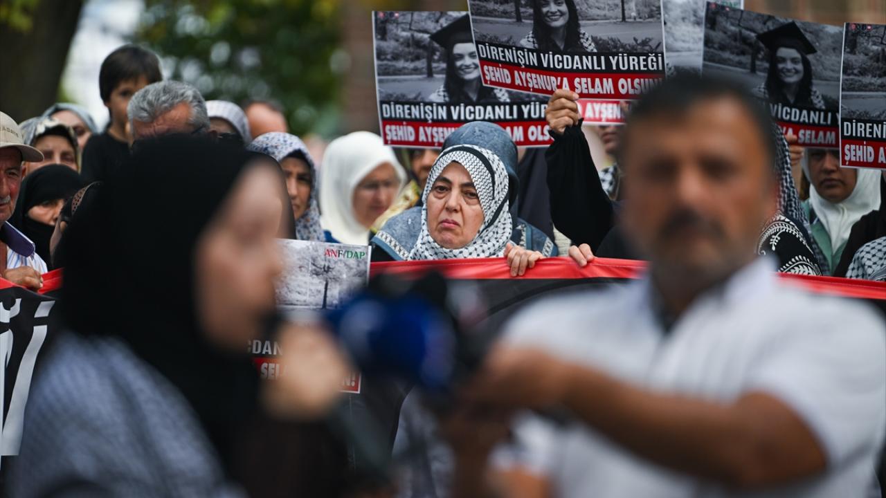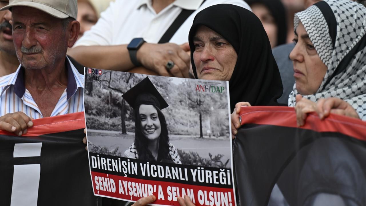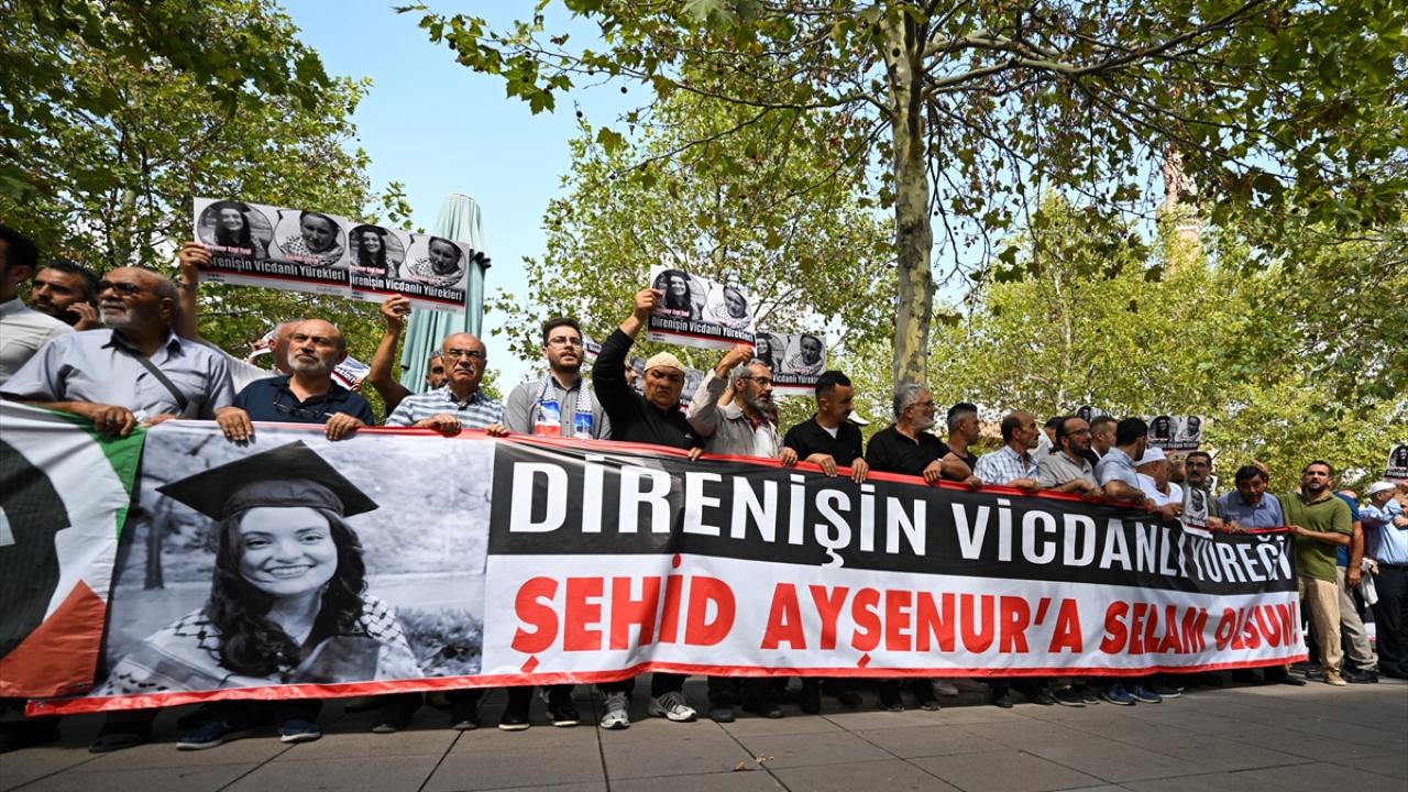 "Direnişin vicdanlı yüreği şehit Ayşenur`a selam olsun" pankartı açan vatandaşlar, İsrail ve ABD aleyhine sloganlar attı.