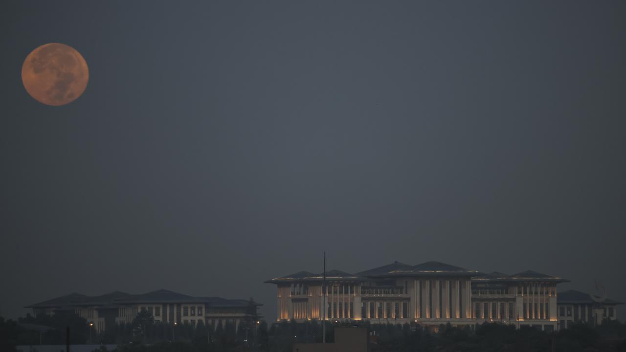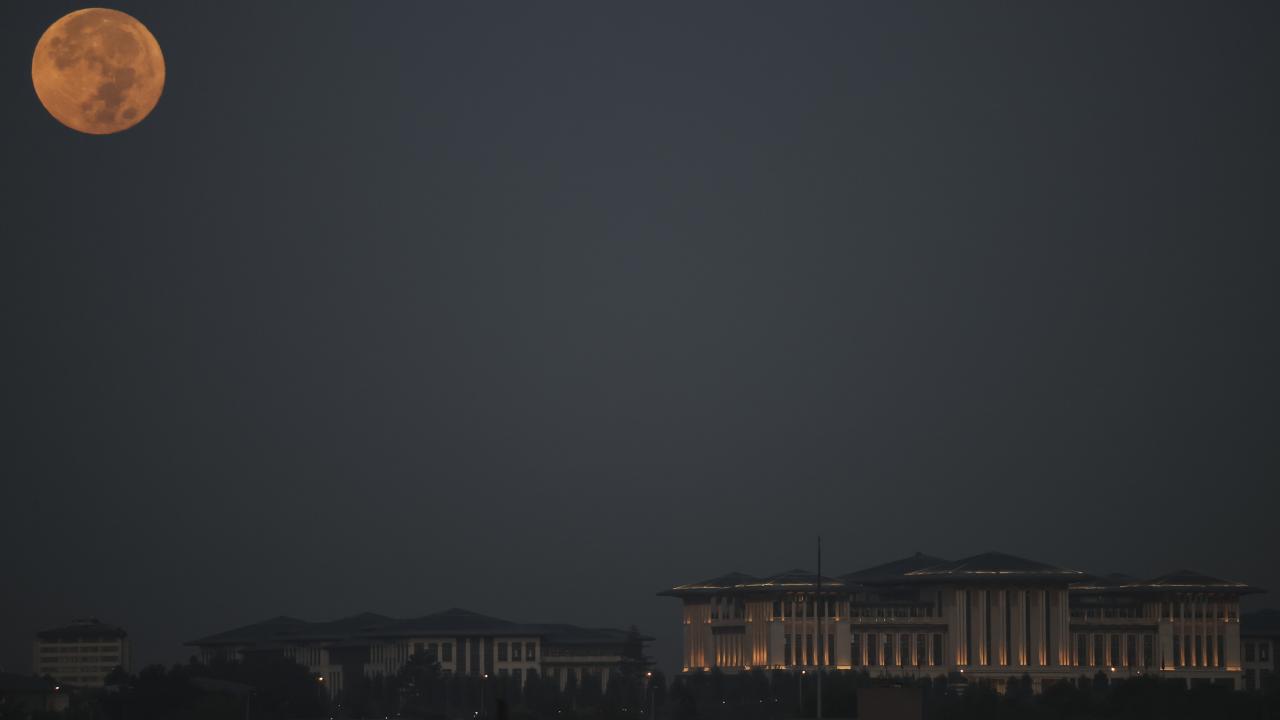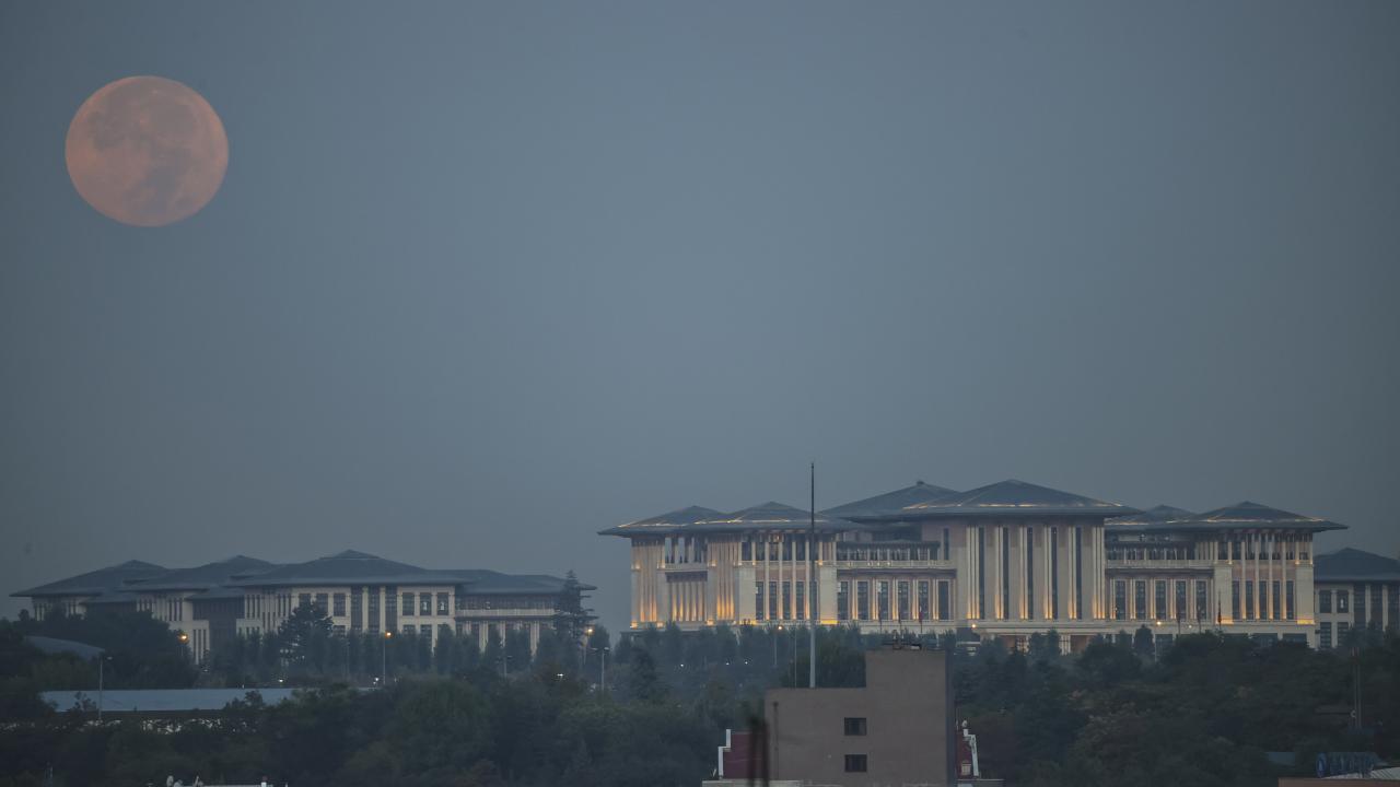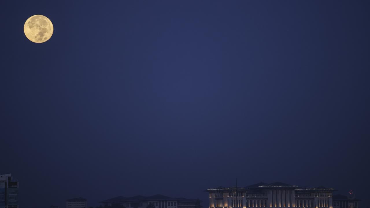 Ankara'da dolunay, sabah saatlerinde Cumhurbaşkanlığı Külliyesi ile birlikte görüntülendi.
