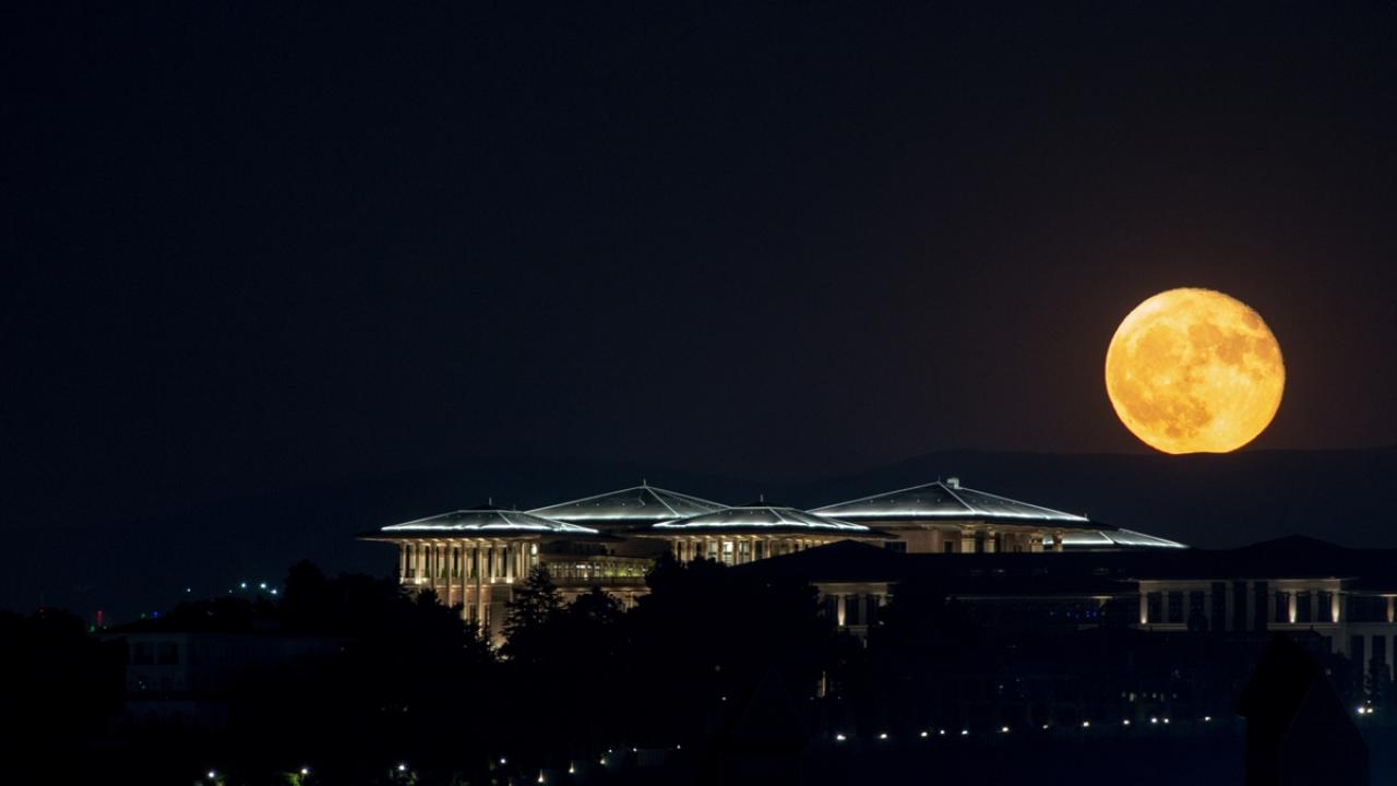 Ankara`da akşam saatlerinde beliren dolunay ile Cumhurbaşkanlığı Külliyesi görüntülendi.