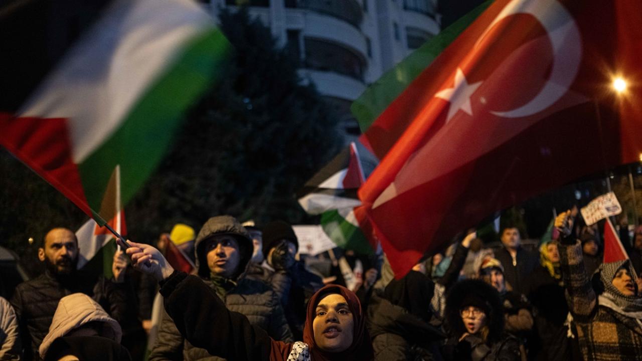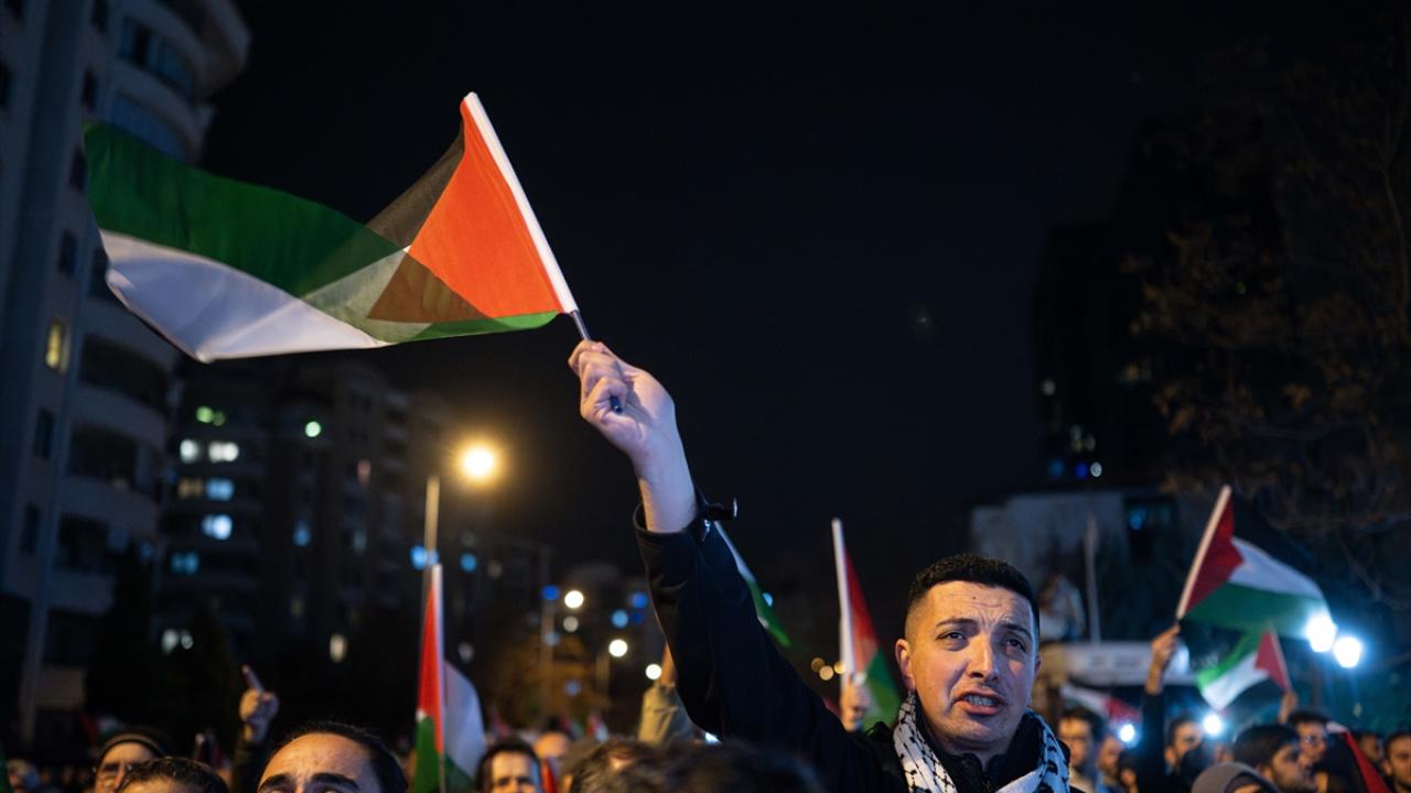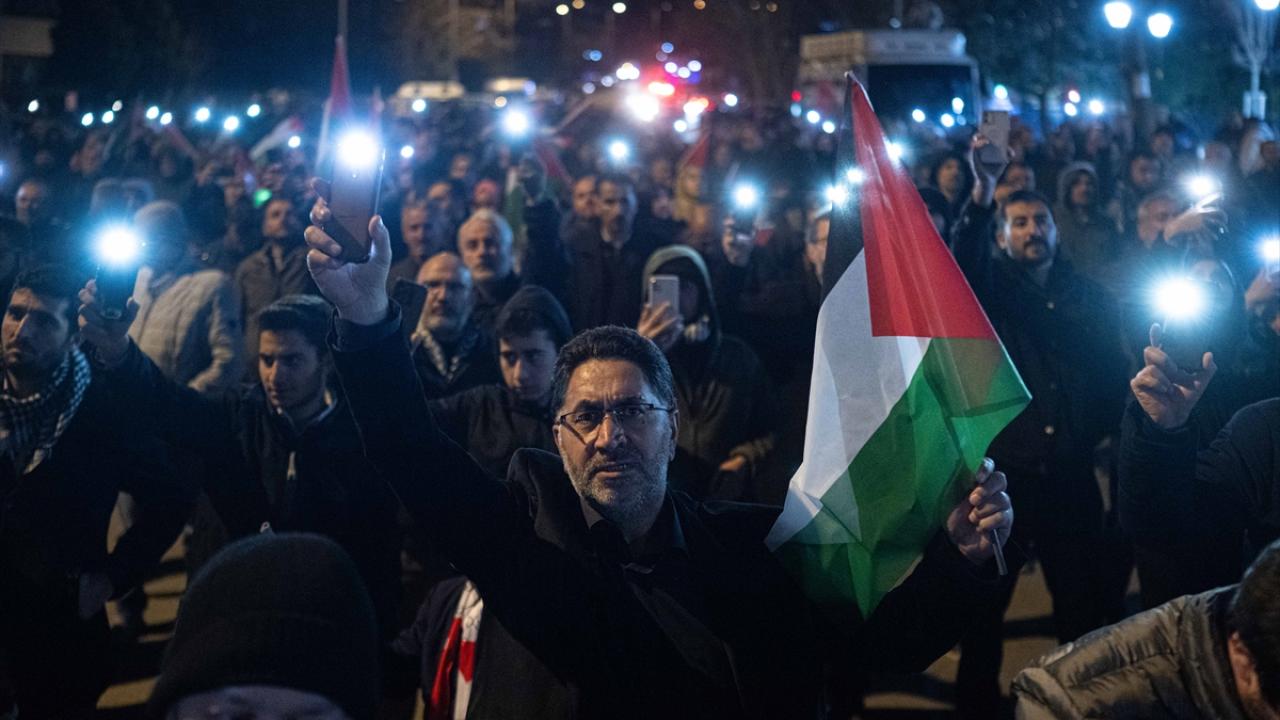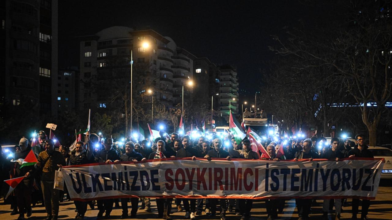 Ankara Filistin Dayanışma Platformu (ANFİDAP) üyeleri, Tuğba Altınok Camisi`nde kılınan teravih namazının ardından ellerinde "Soykırım devam ediyor", "Soykırımı durdurun" yazılı pankartlarla ABD`nin Ankara Büyükelçiliği önüne yürüdü.
