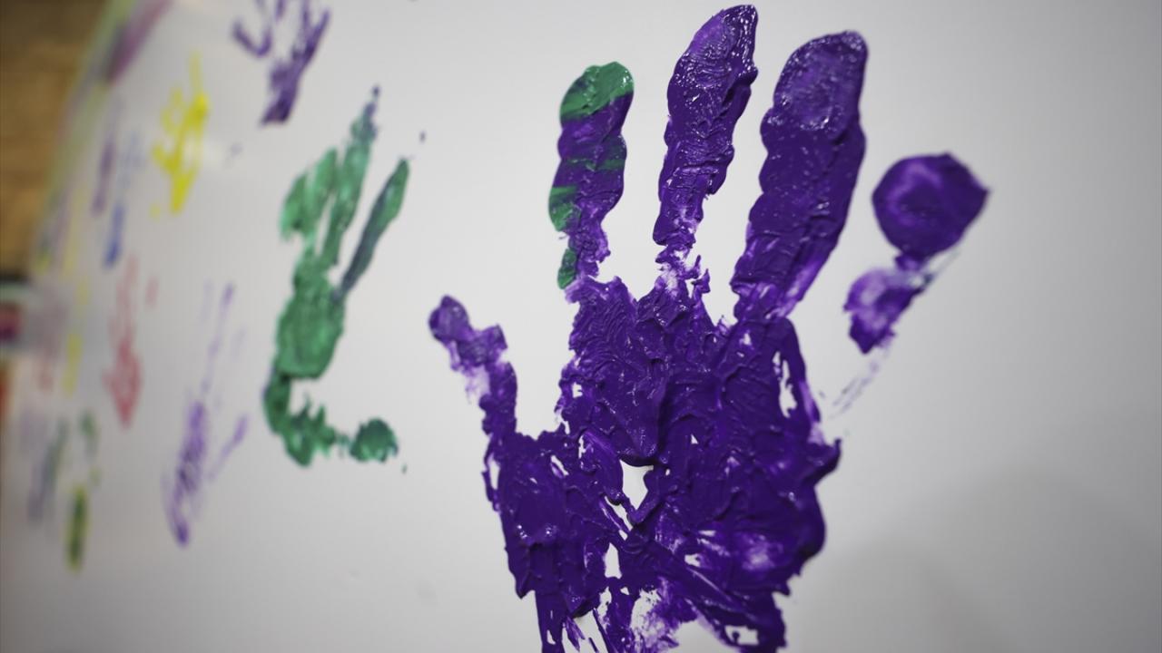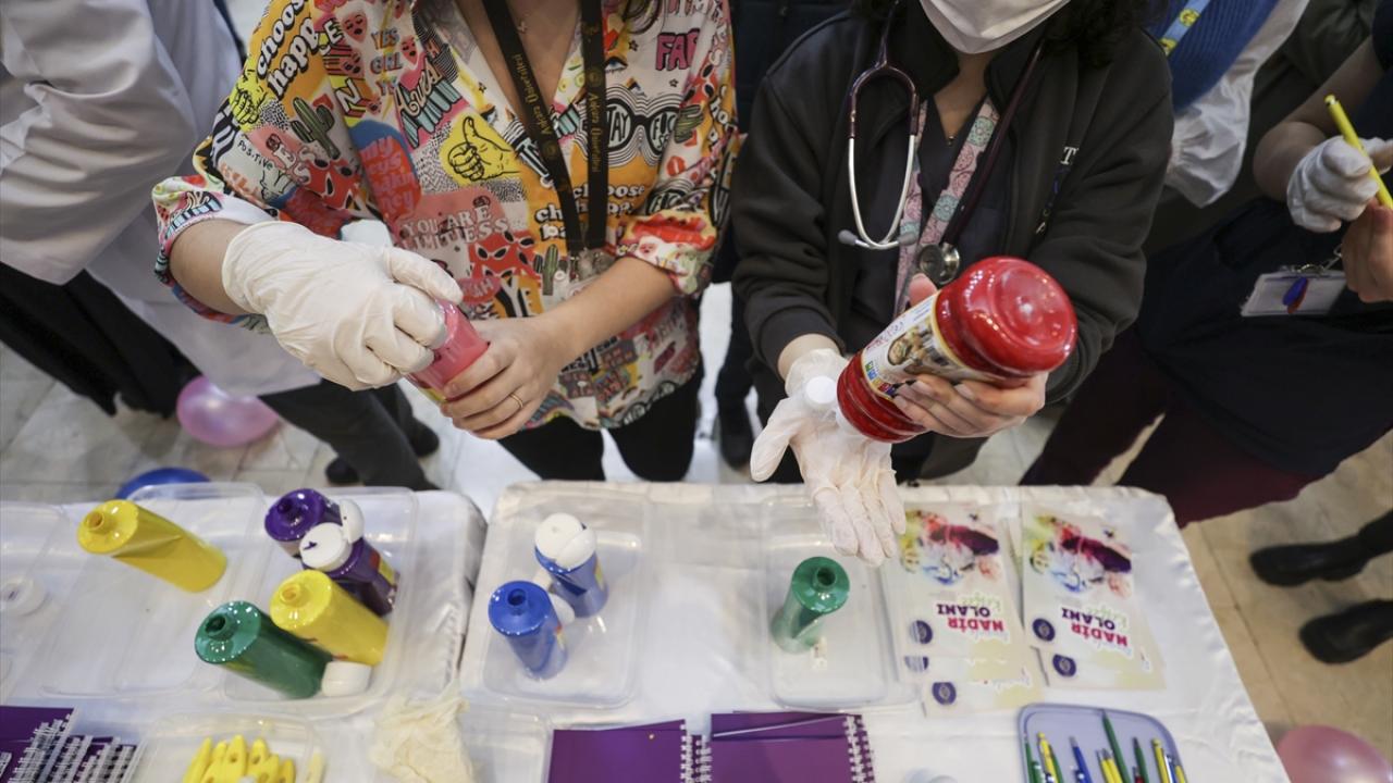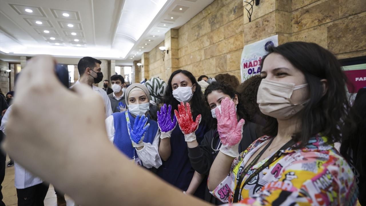 Konuşmalarında ardından Prof. Dr. Ünüvar, Ankara Üniversitesi Tıp Fakültesi Dekanı Prof. Dr. Zehra Aycan ile nadir öğrenci grubu ve asistan hekimler, boyayla panolara el izi bıraktı.