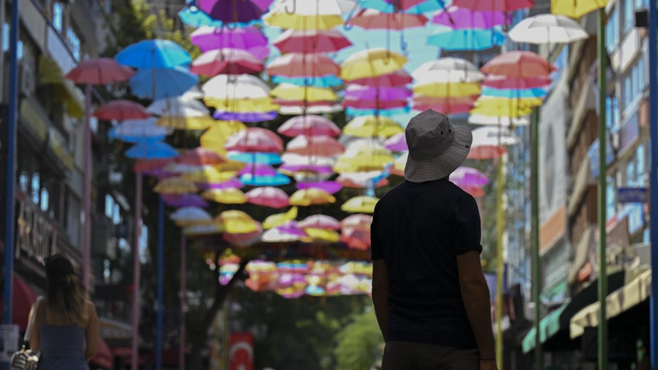 Konur Sokak`ta bazı vatandaşlar güneşten korunmak için şapka kullandı.