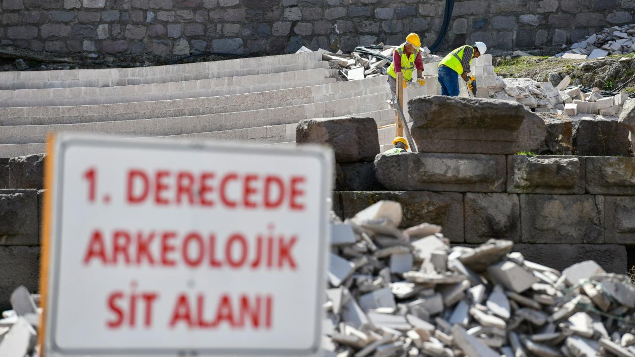 Cumhuriyetin 100. yılında başkent turizmine kazandırılması hedeflenen tiyatroda basamak yerleştirme çalışmaları sürüyor.