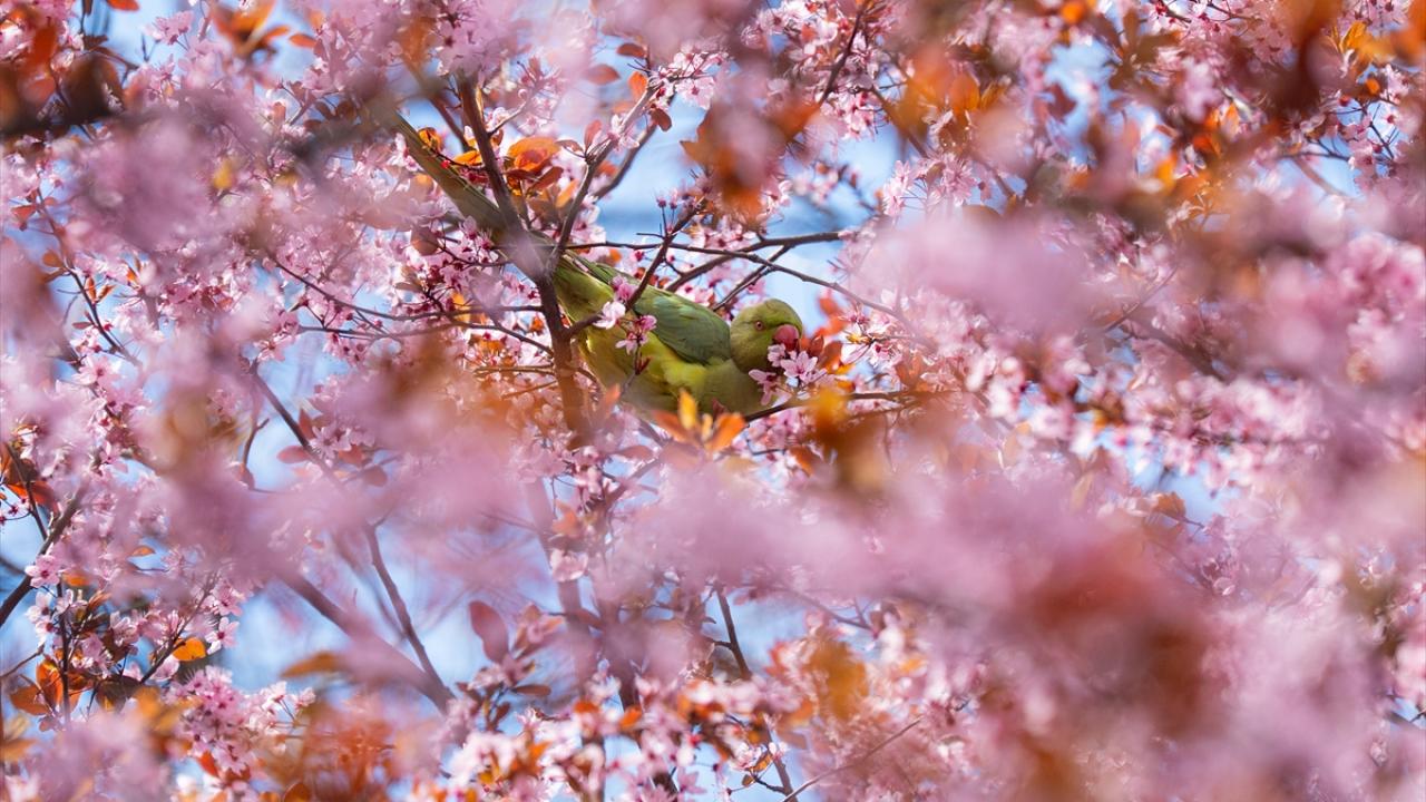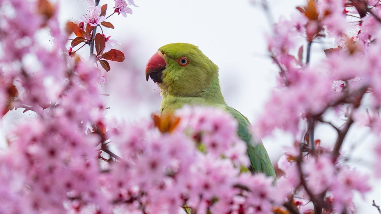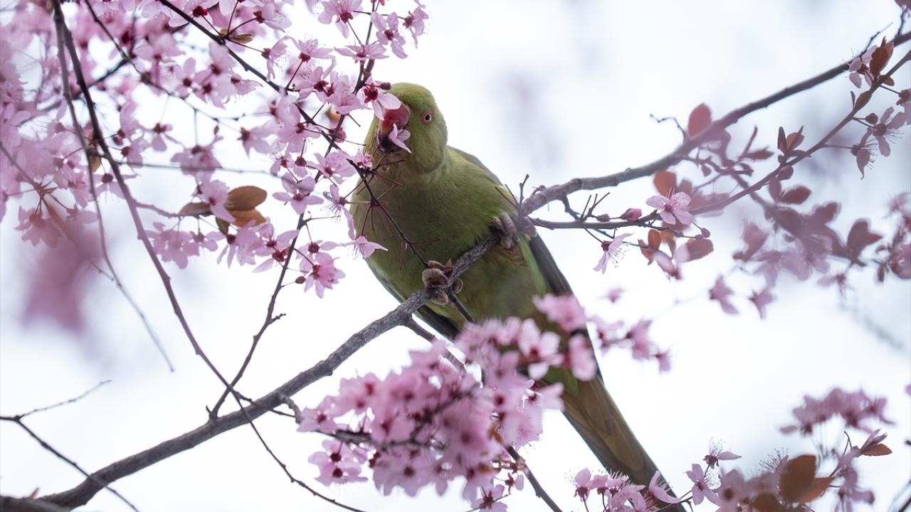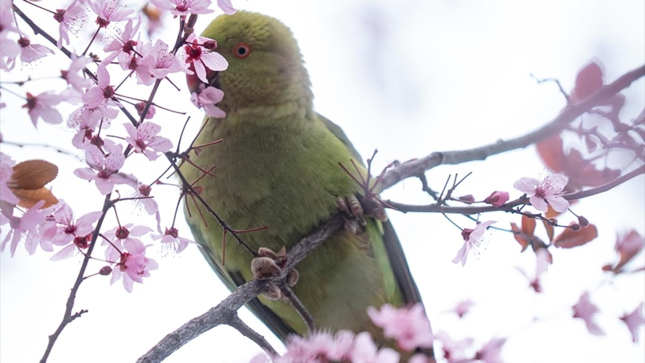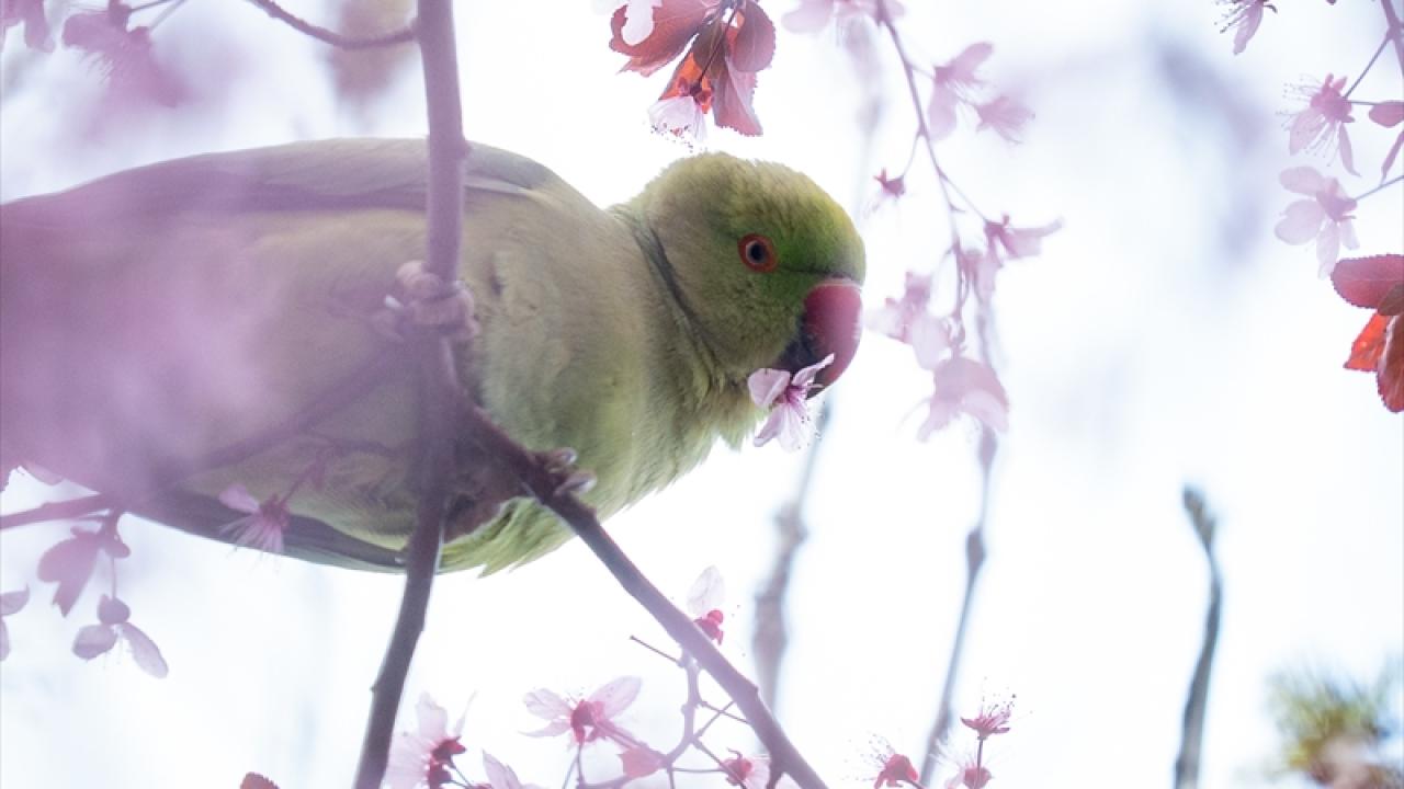 Doğal yaşam alanları Afrika ile Güney Asya olan ve anavatanları dışında popülasyonunu artırarak yerleşik bir tür haline gelen yeşil papağanlar (Psittacula Krameri), Ankara Gençlik Parkı'nda havaların ısınmasıyla açan meyve ağacı çiçekleriyle beslenirken görüntülendi.