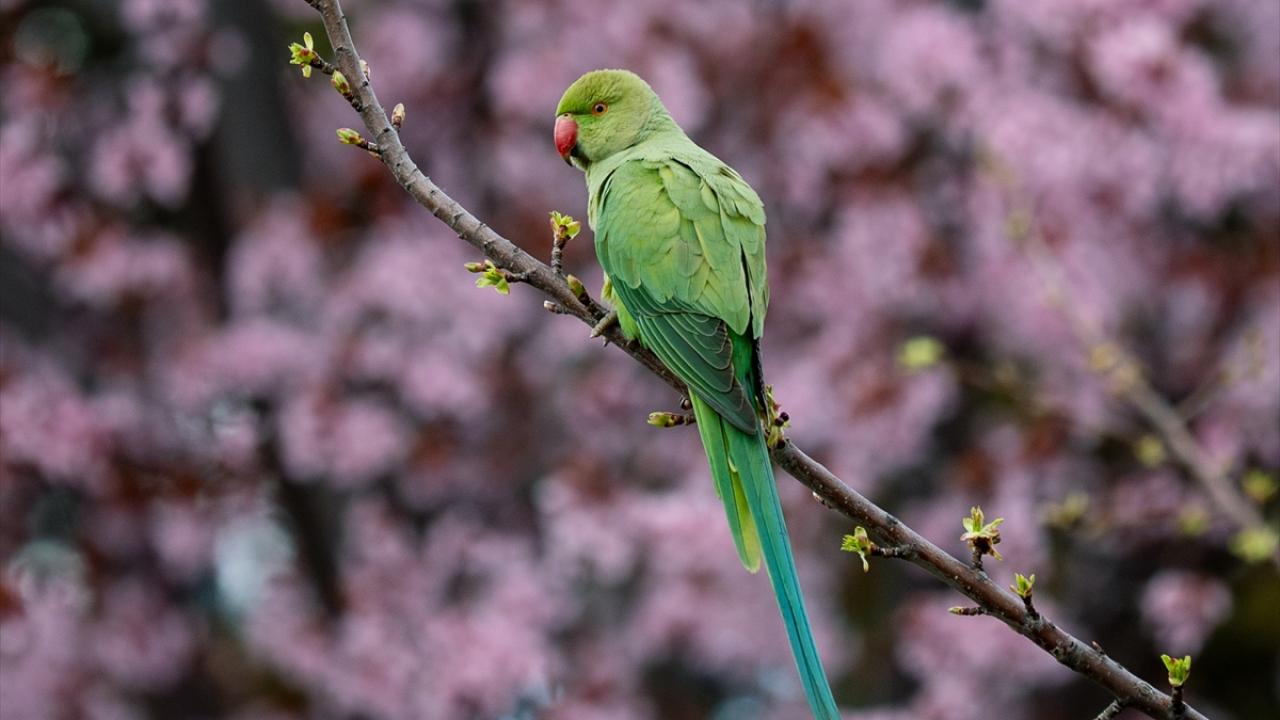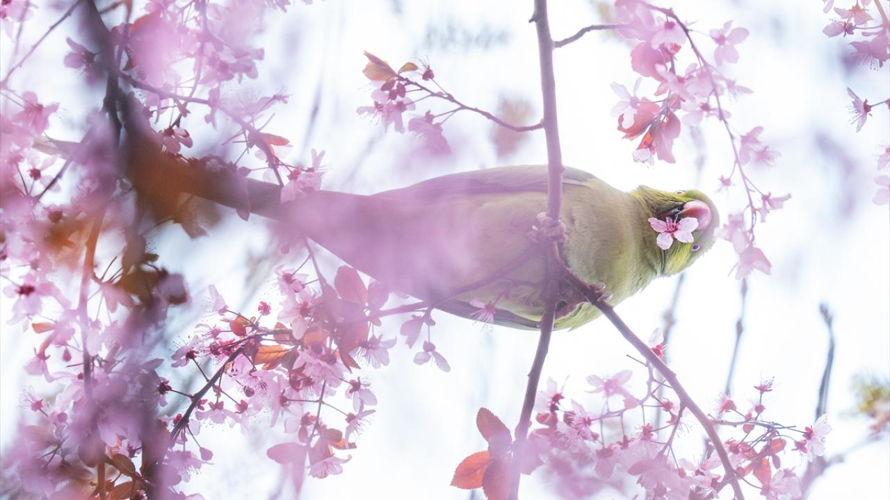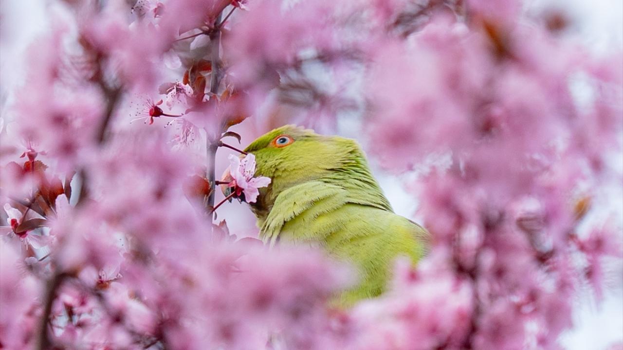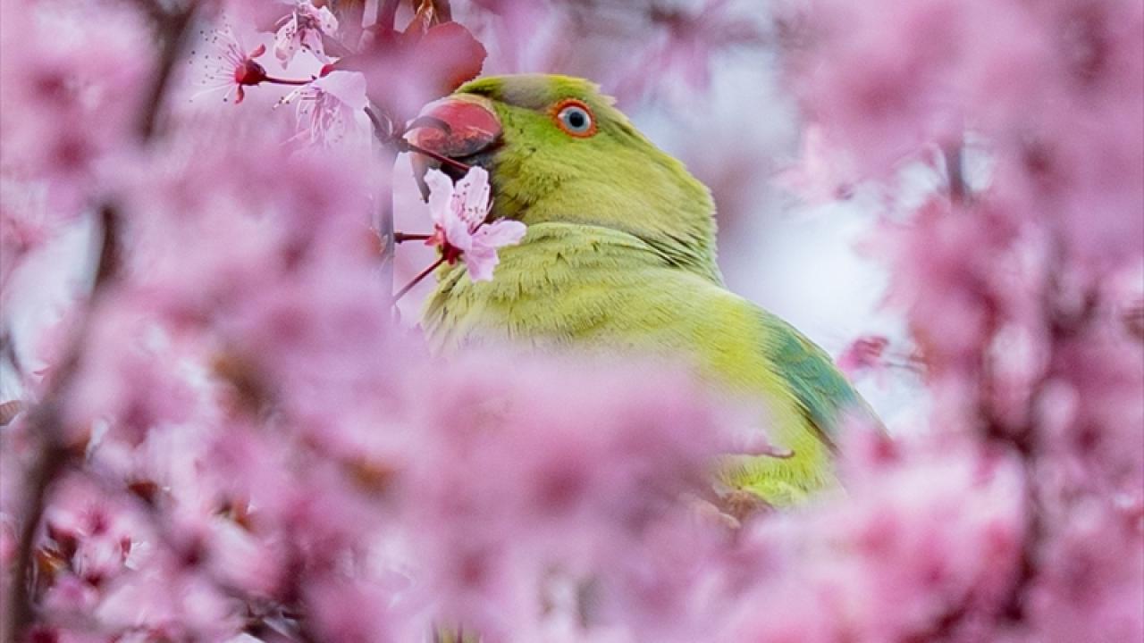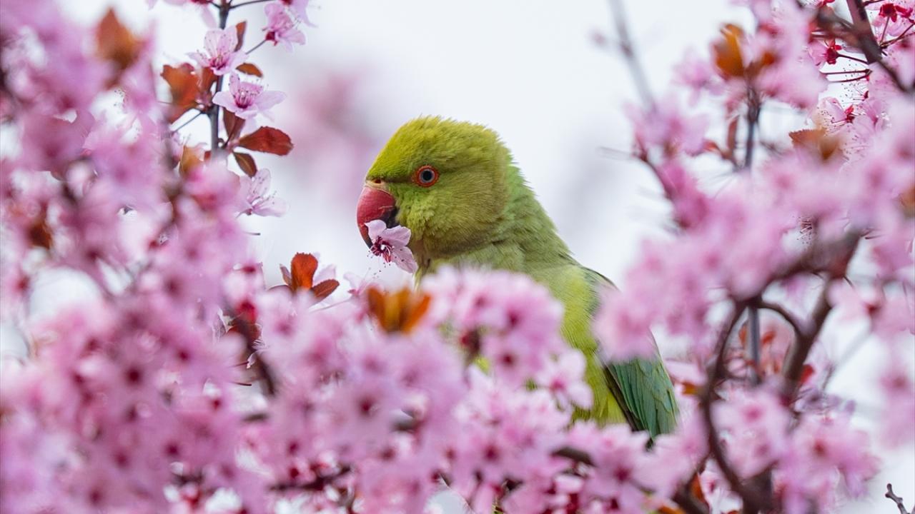 Doğal yaşam alanları Afrika ile Güney Asya olan ve anavatanları dışında popülasyonunu artırarak yerleşik bir tür haline gelen yeşil papağanlar (Psittacula Krameri), Ankara Gençlik Parkı'nda havaların ısınmasıyla açan meyve ağacı çiçekleriyle beslenirken görüntülendi.