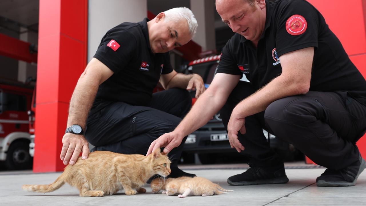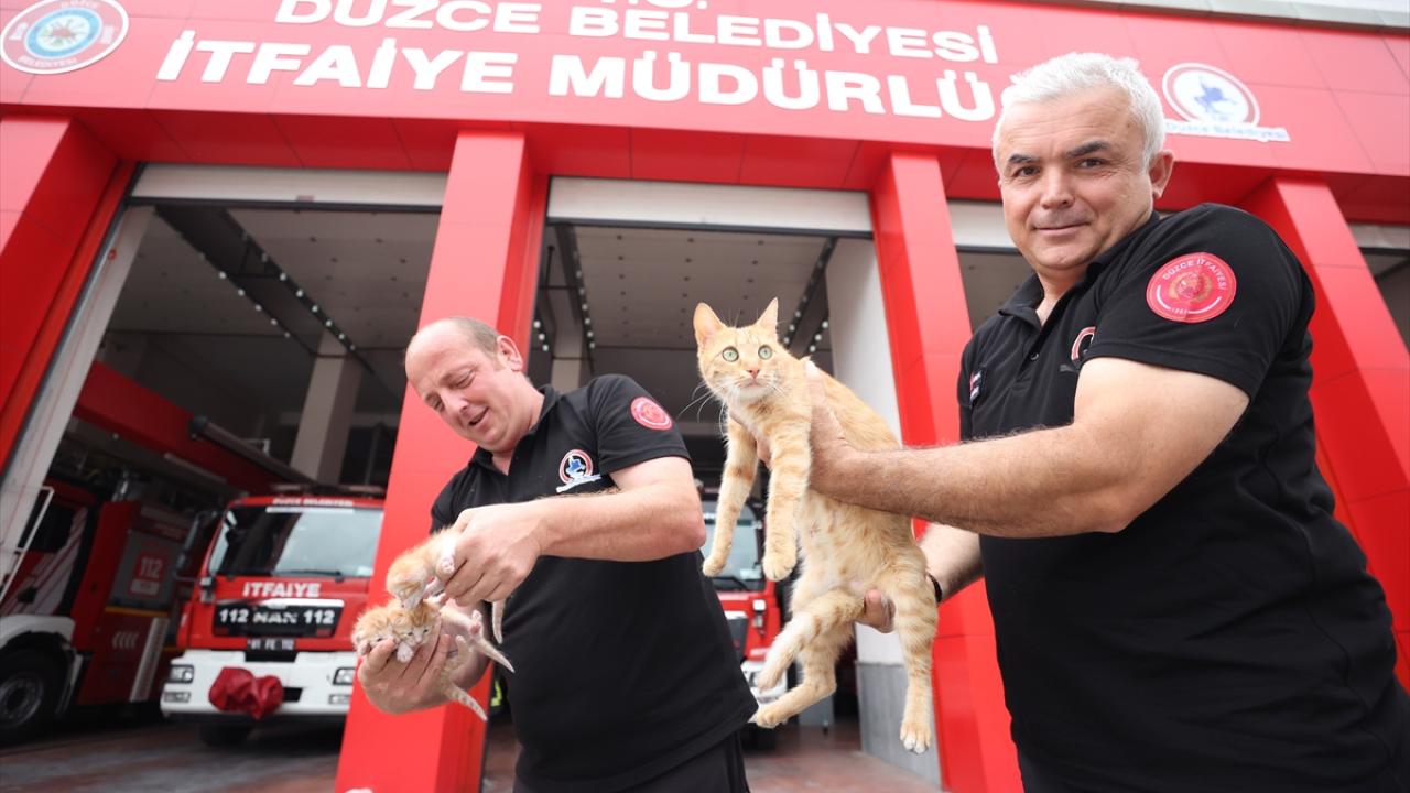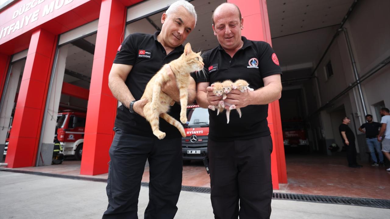 Düzce Belediyesi İtfaiye Müdürlüğü tarafından sokaktan sahiplenilen kedi ile yaklaşık 2 hafta önce dünyaya gelen 3 yavrusu, itfaiyecilerin maskotu haline geldi.