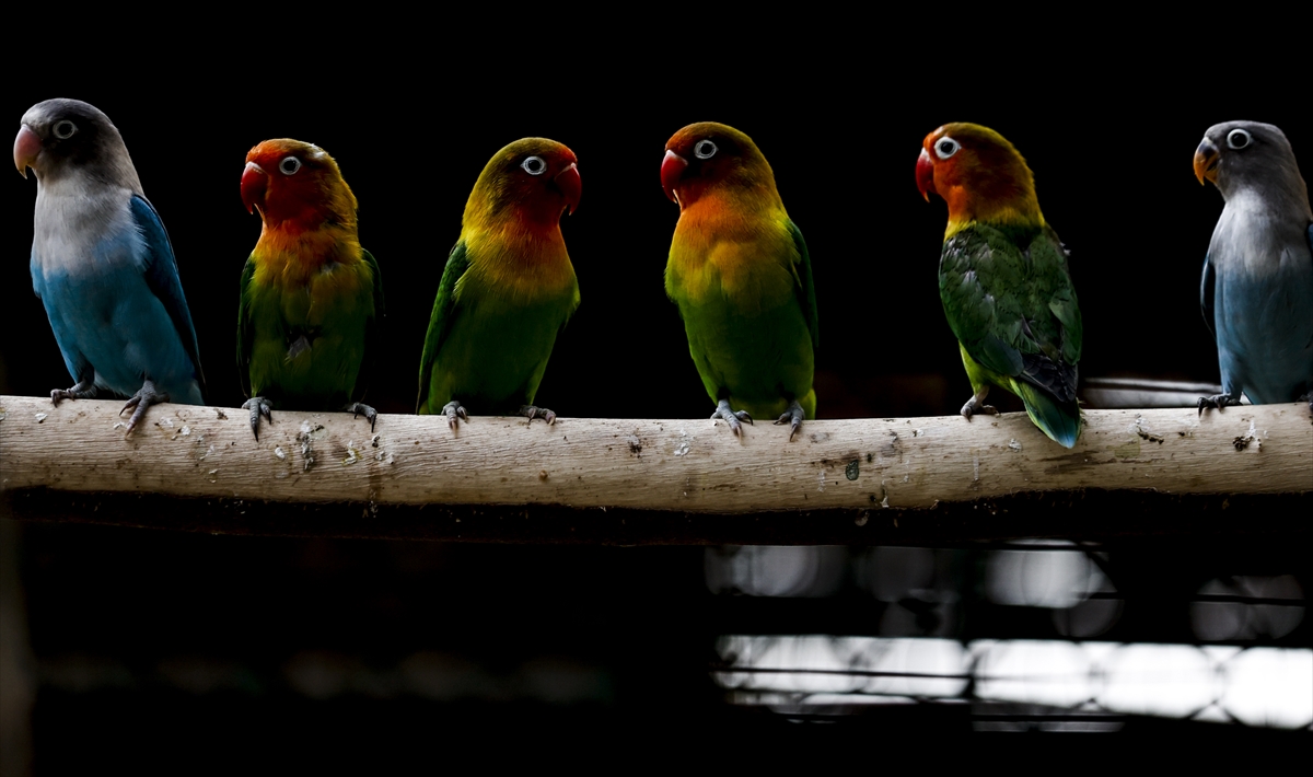 Hayvanat bahçesindeki rengarenk ara papağanları dikkati çekiyor.