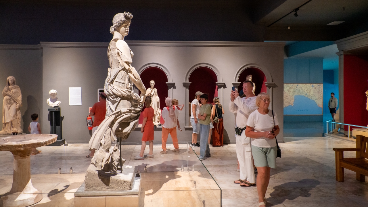 Gece müzeciliği kapsamında 15 Haziran'da başlayan uygulamayla akşam saatlerinde de açık olan Antalya Müzesi, yerli ve yabancı turistler tarafından ilgi görüyor.