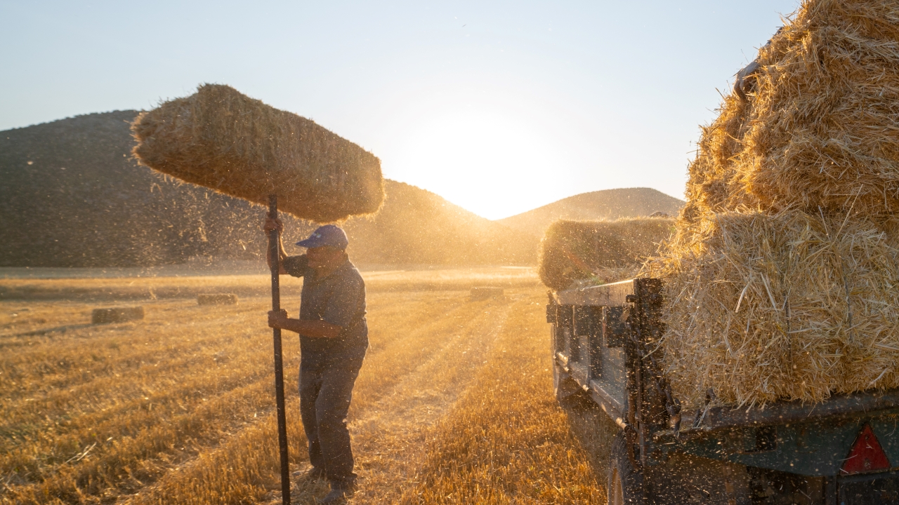 Ortalama 30 kilogramlık balyalar çiftçiler tarafından şiddetli güneş altında ve saman tozları arasında traktörlere taşınıyor.