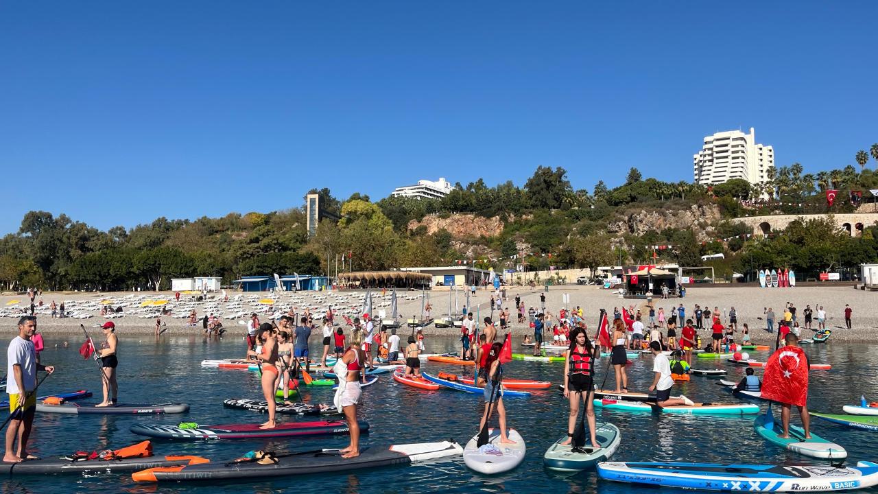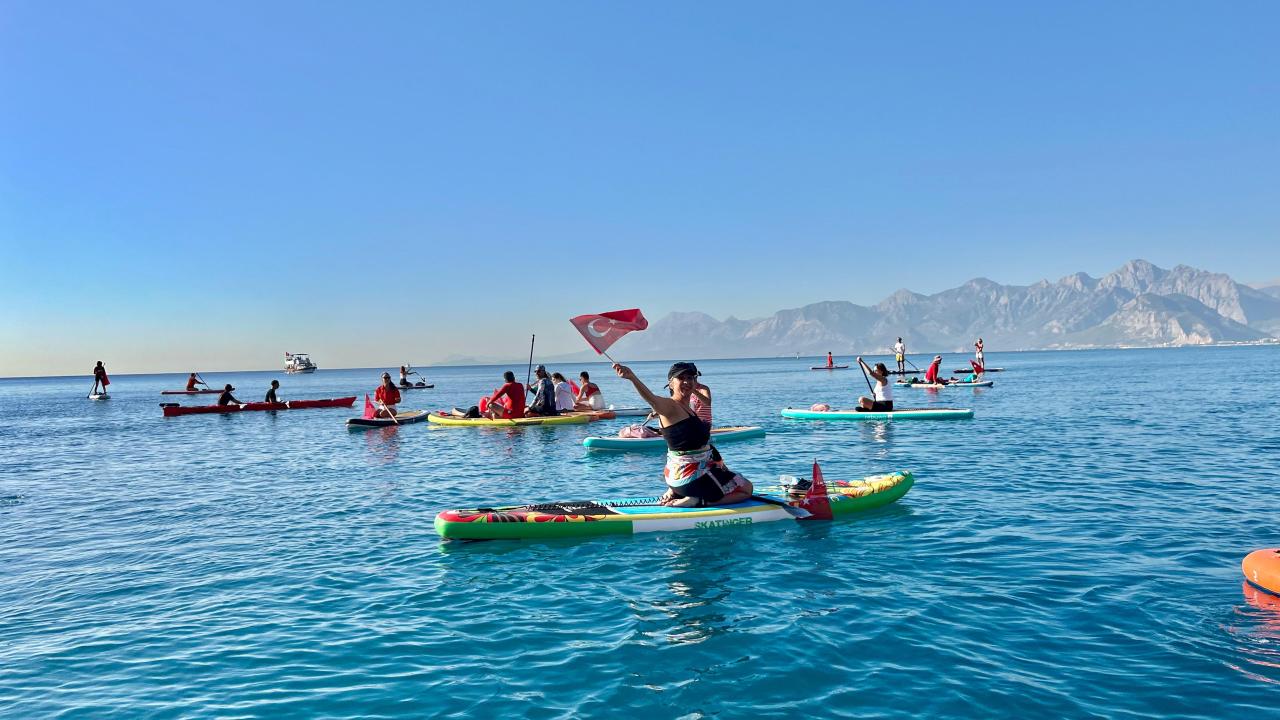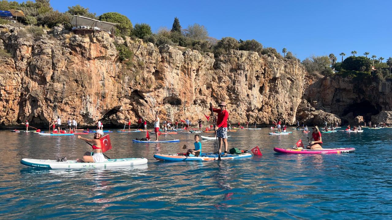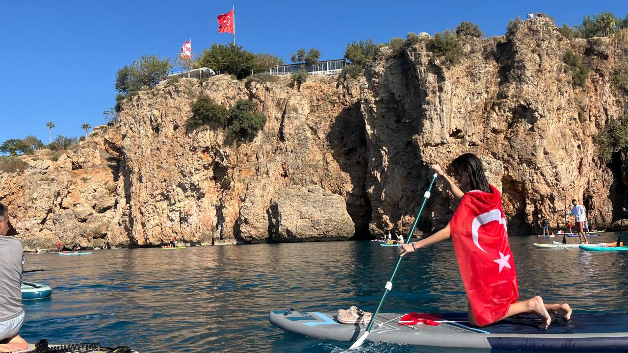 Antalya'da, 29 Ekim Cumhuriyet Bayramı dolayısıyla denizde kutlama yapan dalgıçlar ve sporcular, Türk bayrağı açtı. `Kürek sörfü` olarak da bilinen ayakta kürek çekme ile programa katılanlar etkinliğe renk kattı.