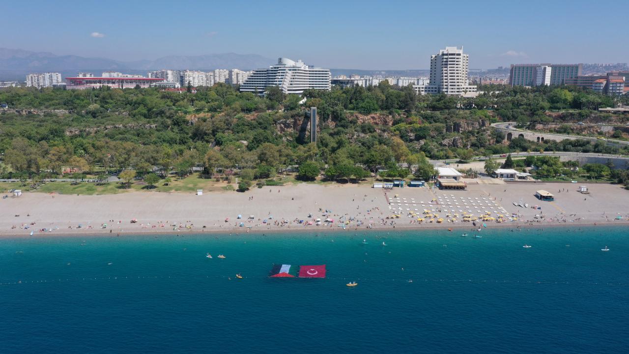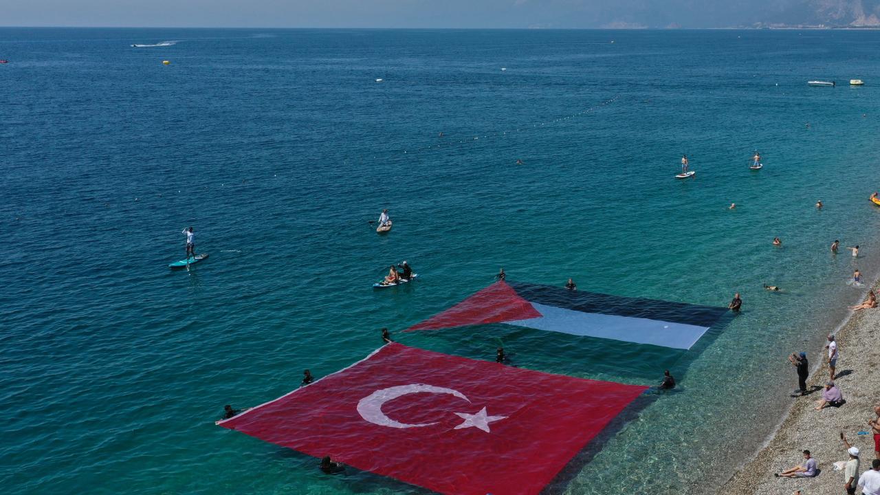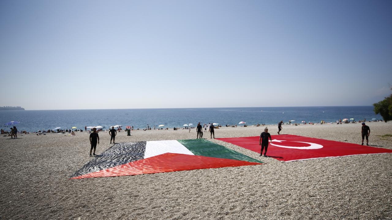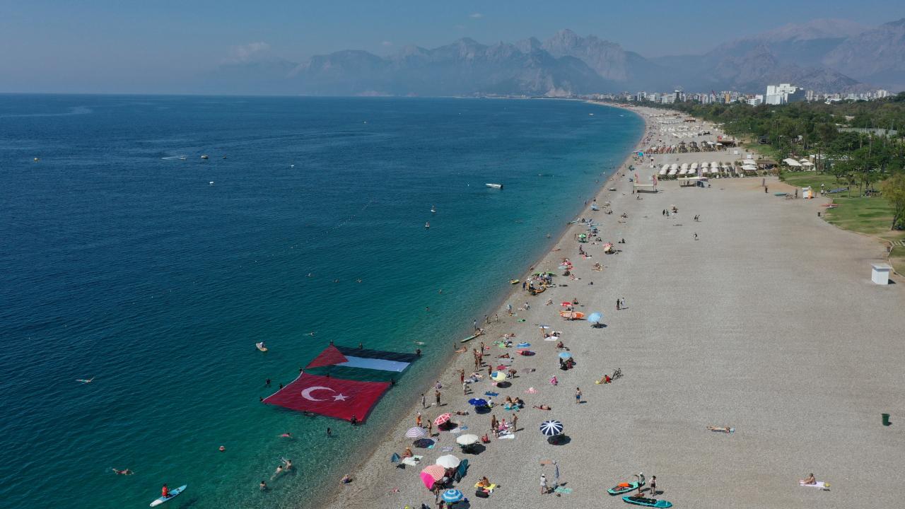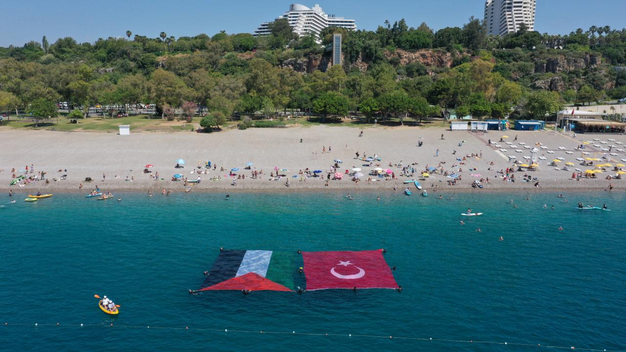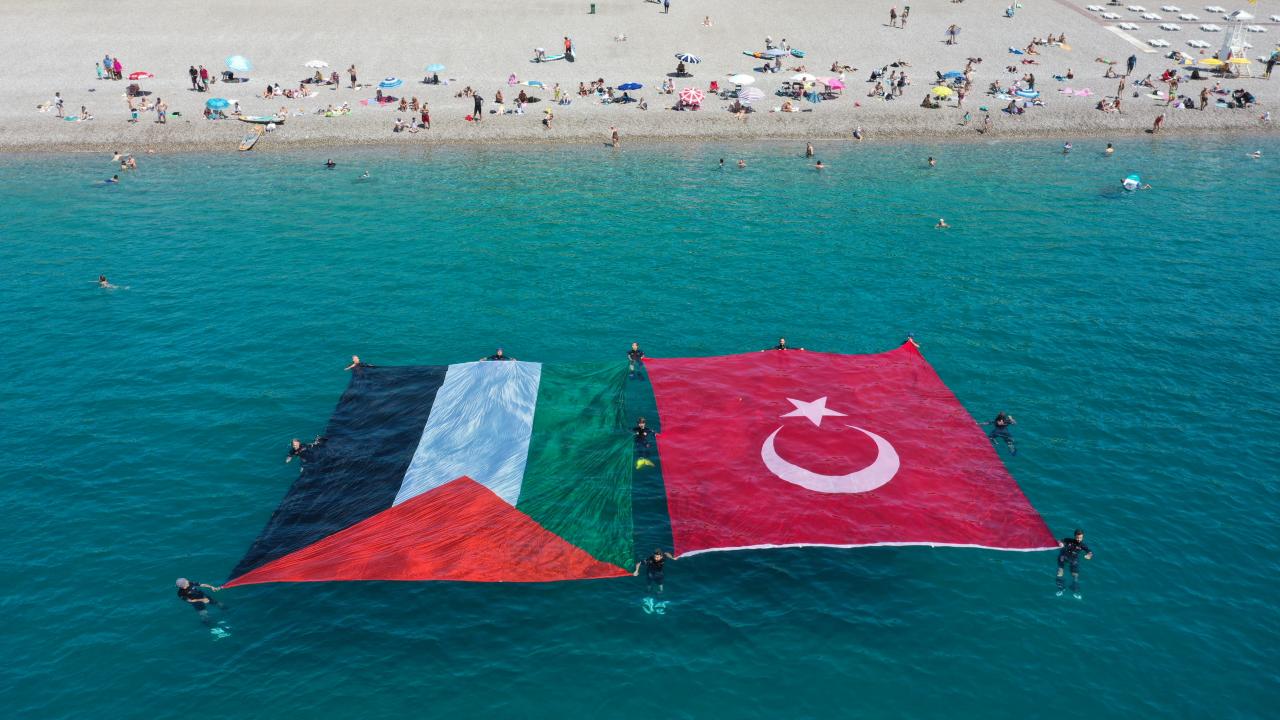Antalya Konyaaltı Plajı'nda İnsan Hak ve Hürriyetleri İnsani Yardım Vakfı arama kurtarma üyesi dalgıçlar, Filistin'e destek olmak için deniz yüzeyinde Türk ve Filistin bayrağı açtı.