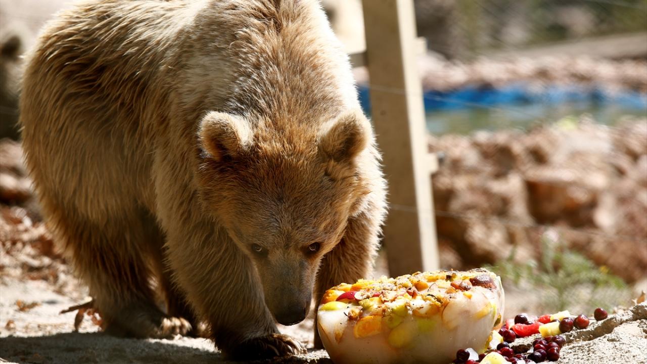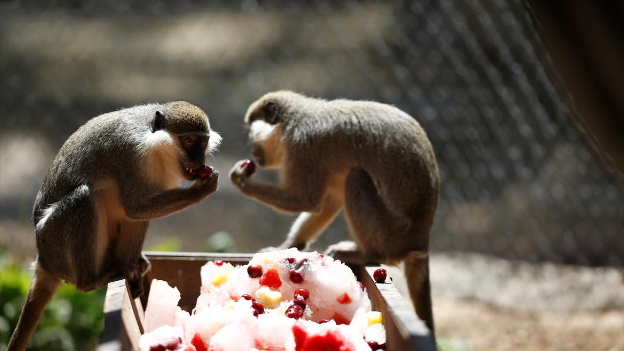 Doğal yaşam parkı sakinlerinden bozayı, lemur ve maymunların karpuz, portakal, kiraz, muz, elma gibi meyvelerden oluşan buzlu kokteyllerini yediği anlar ziyaretçilerin de ilgisini çekiyor.