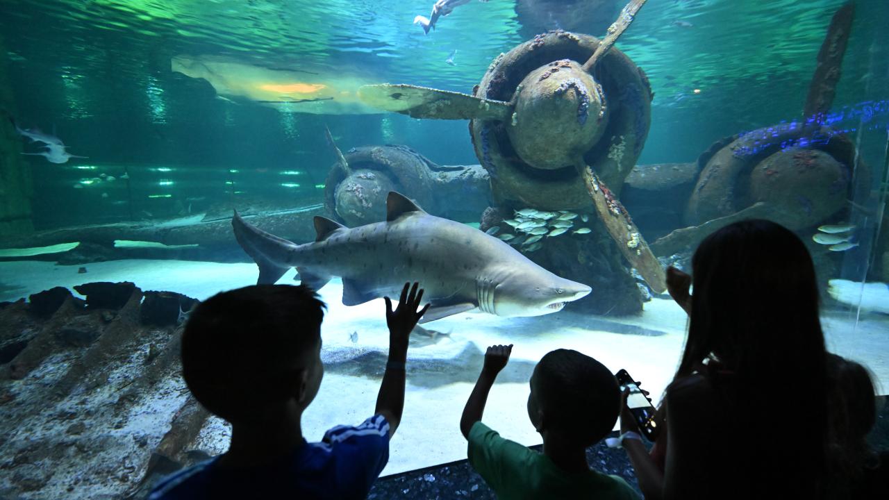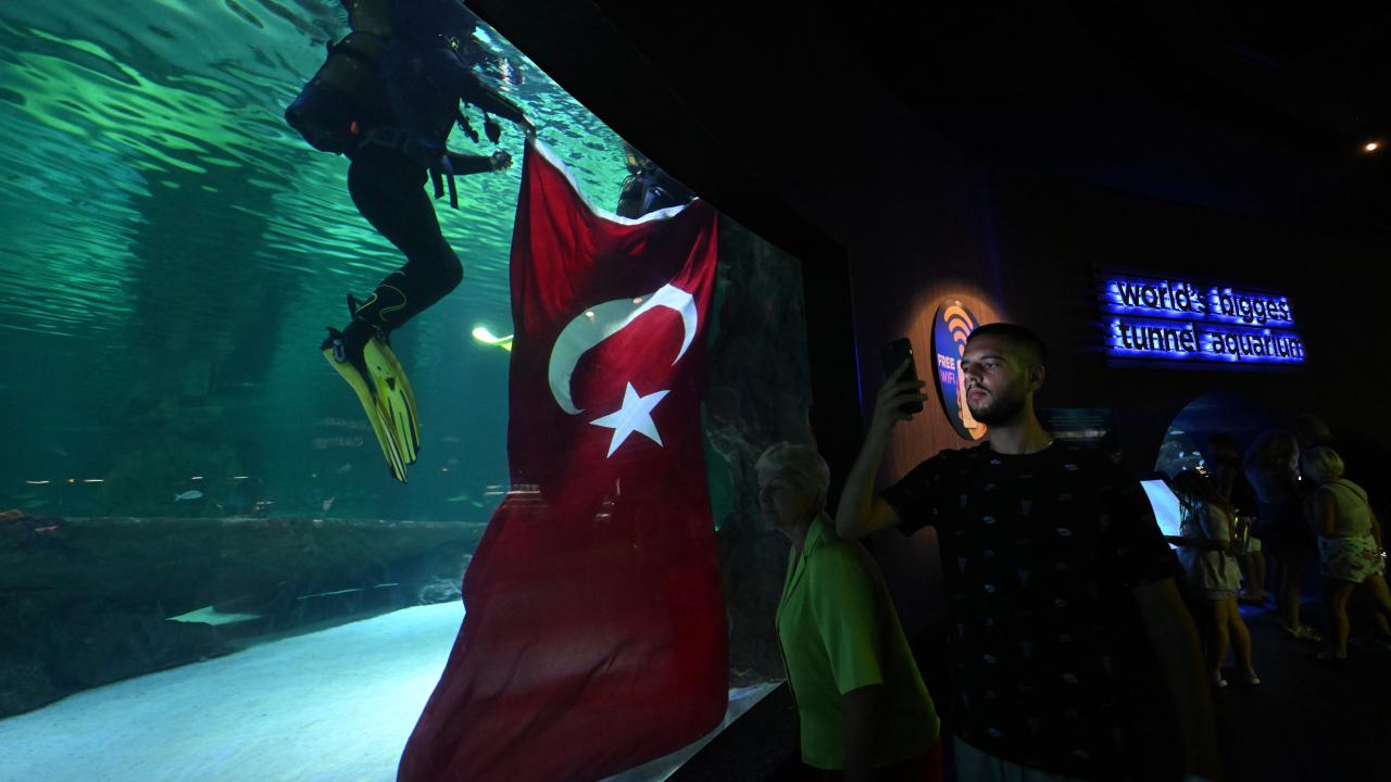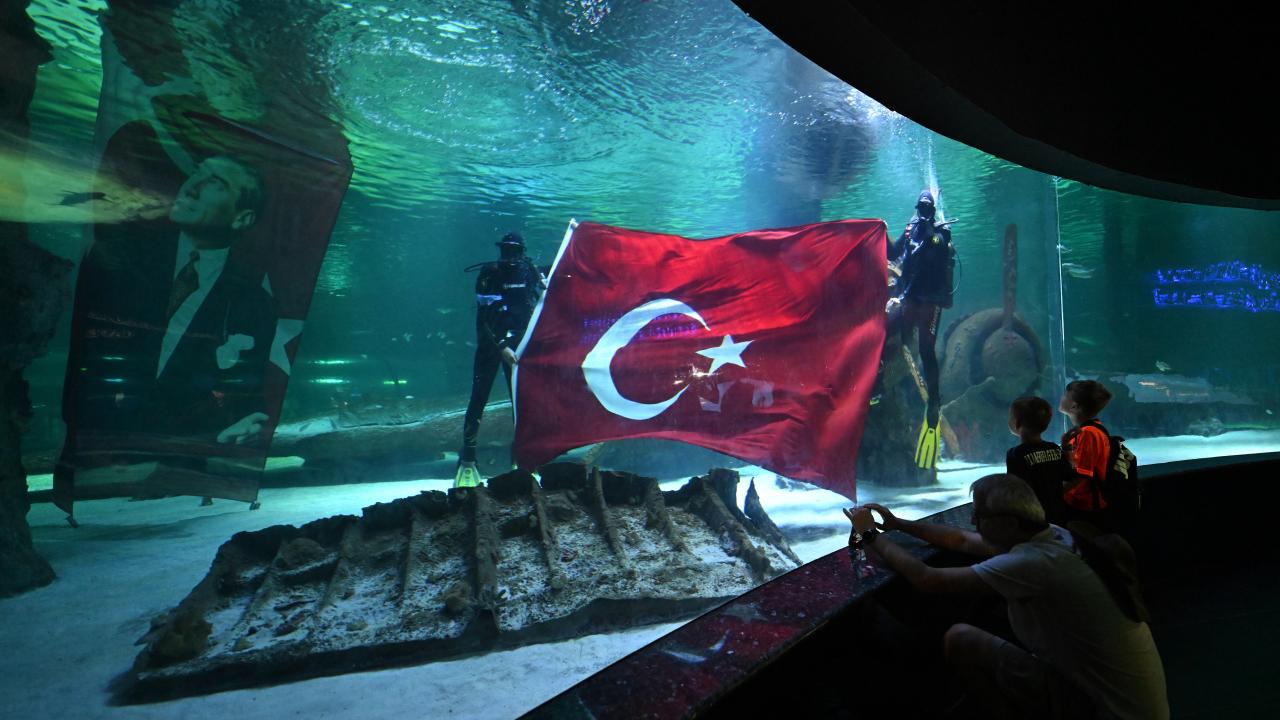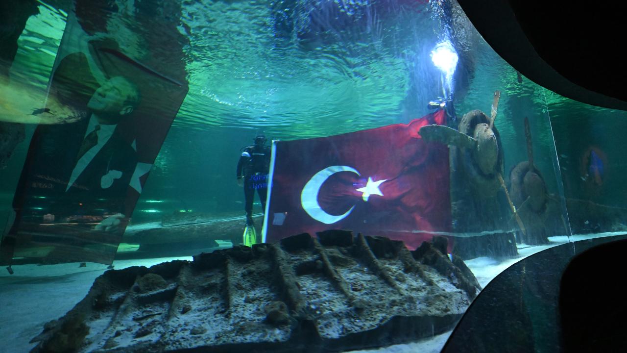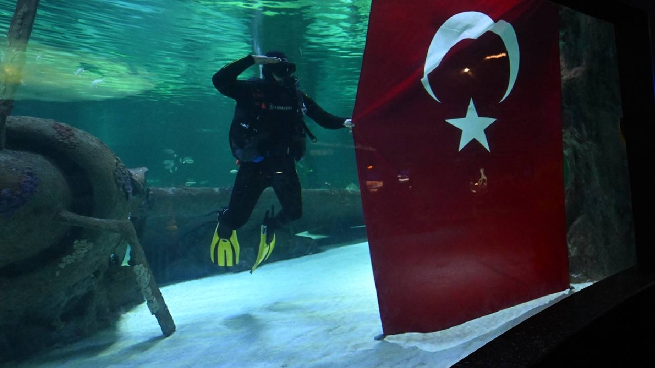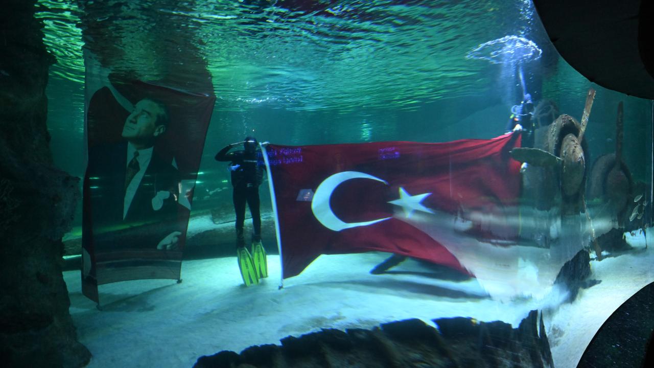 İçerisinde sand tiger cinsi köpek balığı da olmak üzere farklı türlerde balıkların olduğu ana tanka dalan dalgıçların Türk bayrağı ve Atatürk`ün resmini açtıklarını kaydeden Doğan, ziyaretçilerin de kutlamayı dikkatle takip ettiklerini belirtti.
