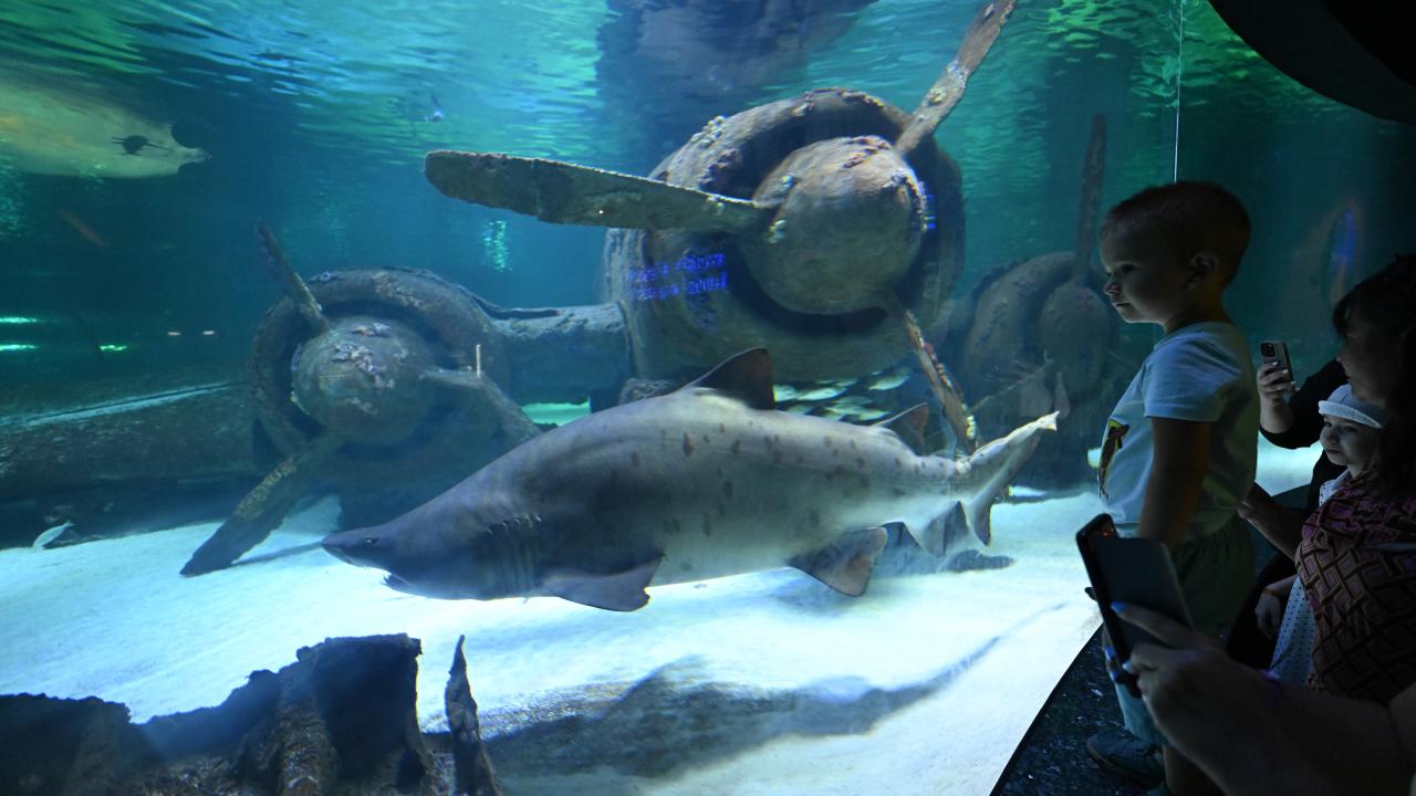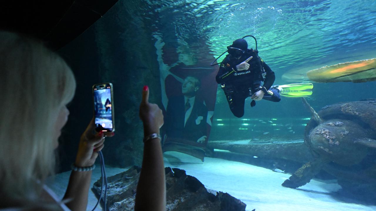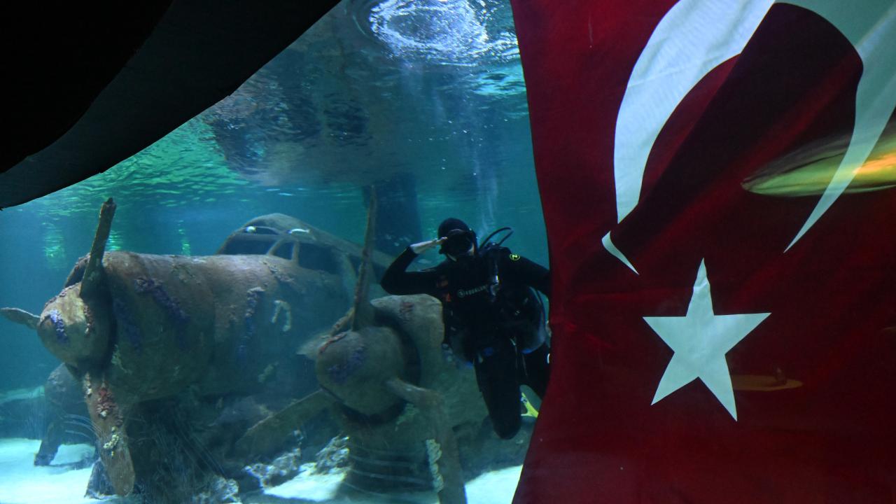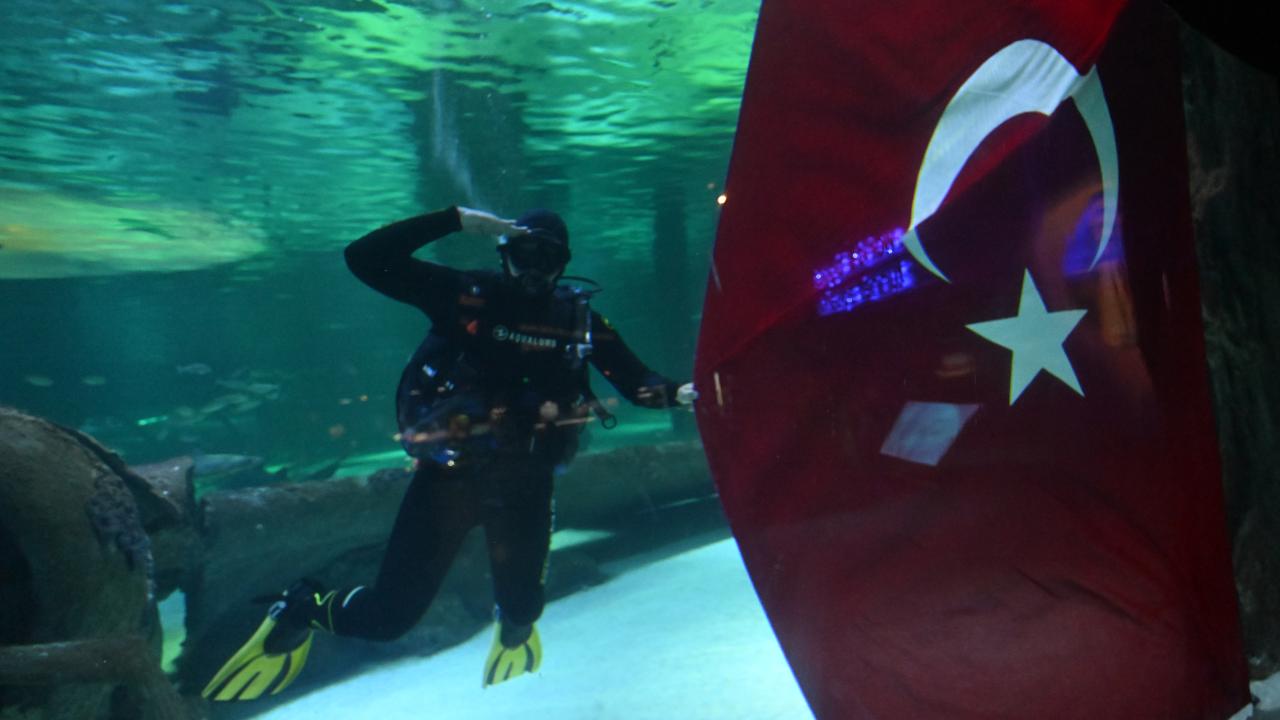Akvaryumda tank temizliği, bakım, onarım ve köpek balıklarının beslenmesi gibi işlerde görev alan dalgıçlar, 30 Ağustos Zafer Bayramı dolayısıyla dalış gerçekleştirdi.