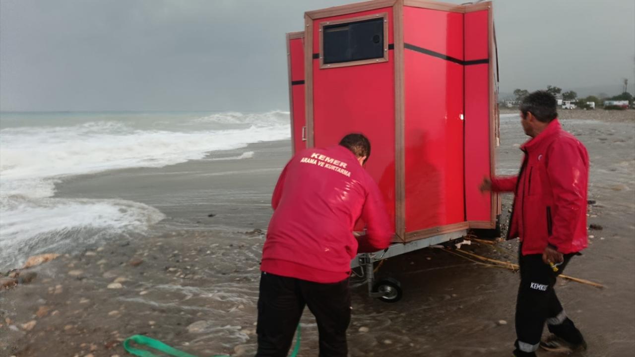Kemer’de ise Çamyuva sahilindeki iki karavan denize sürüklendi.