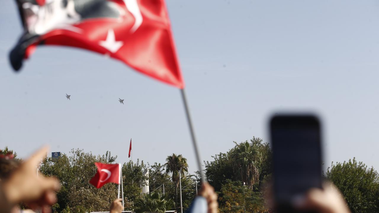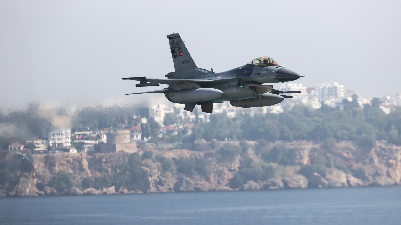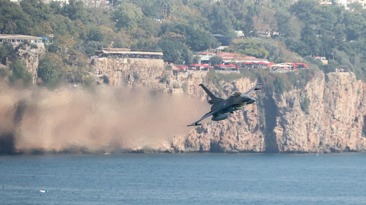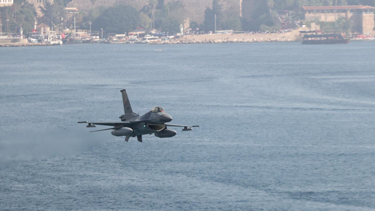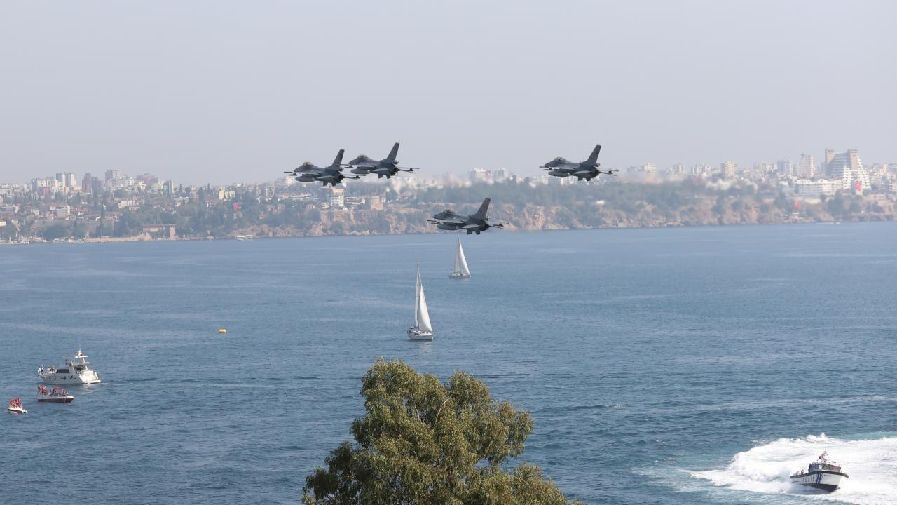 Antalya'da, Cumhuriyet'in 100. yıl dönümü dolayısıyla F-16 savaş uçakları gösteri uçuşu gerçekleştirdi.