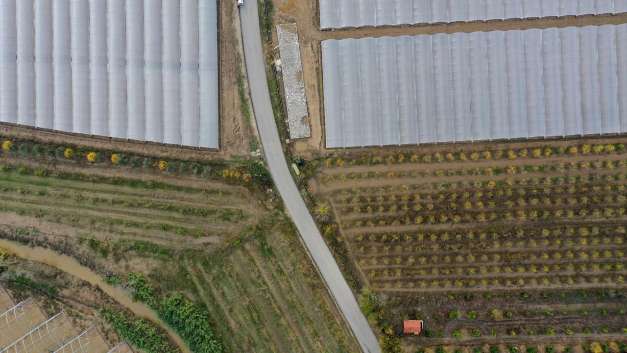 Belediye ekipleri selin etkisiyle gelen çamurlu yolları temizlerken, çiftçiler de seralarda su tahliye işlemi yapıyor.