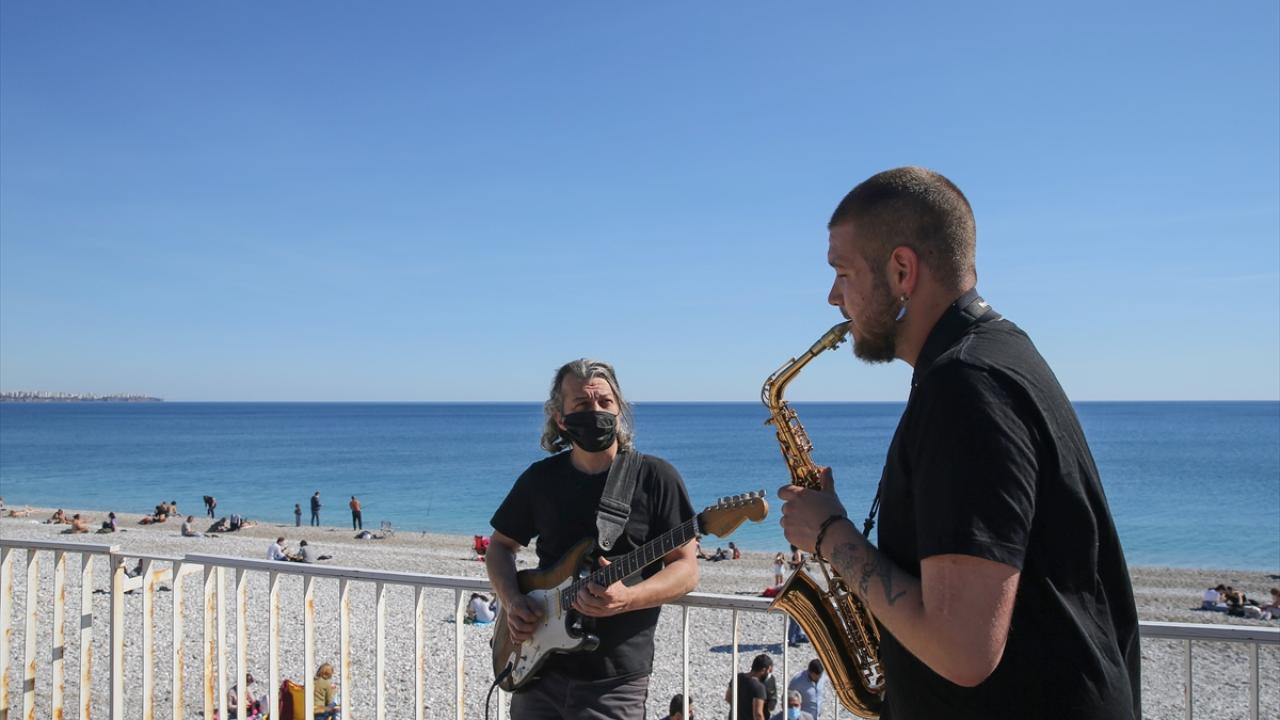 Konyaaltı Sahili`ndeki sokak müzisyenleri ise seslendirdikleri şarkılarla keyifli dakikalar yaşattı.