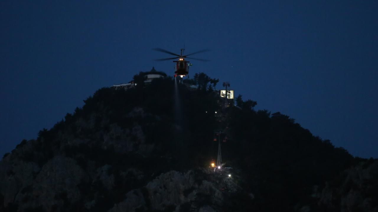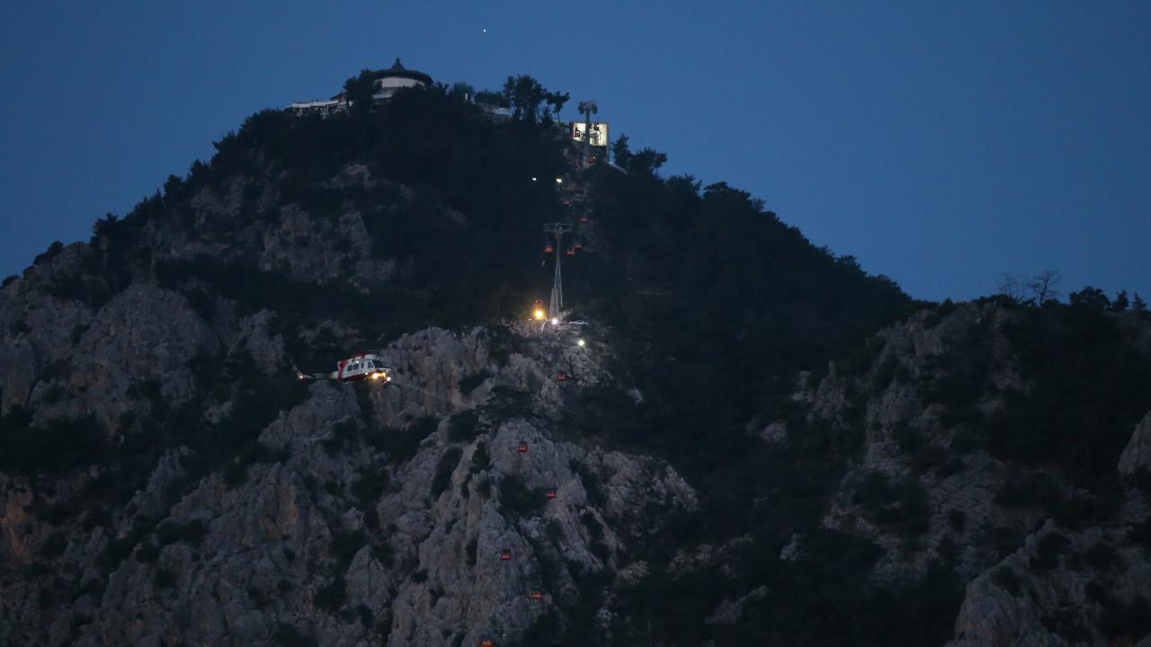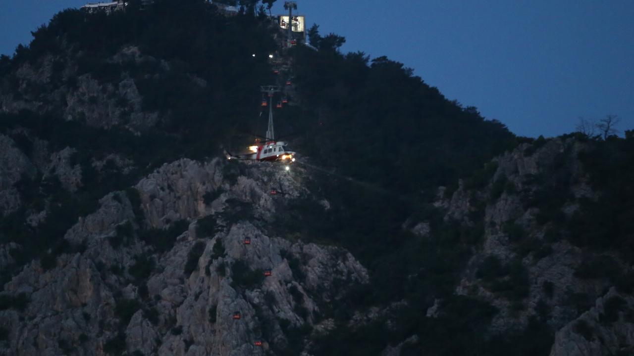 Antalya'nın Konyaaltı ilçesindeki Tünektepe Teleferik Tesisi'nde kaza nedeniyle kabinlerde mahsur kalanlar, gece görüşlü helikopterlerin yardımıyla kurtarılıyor.
