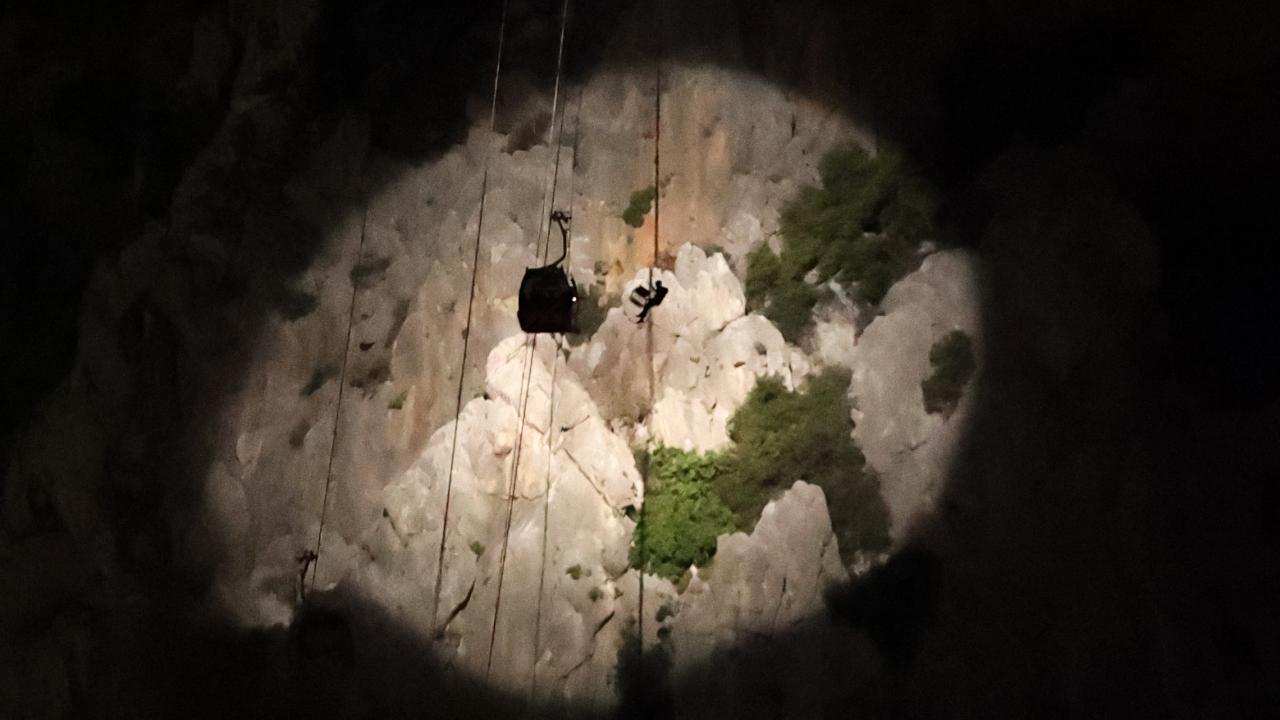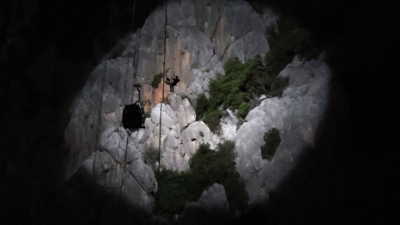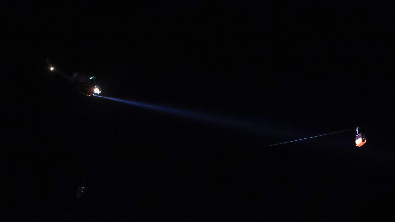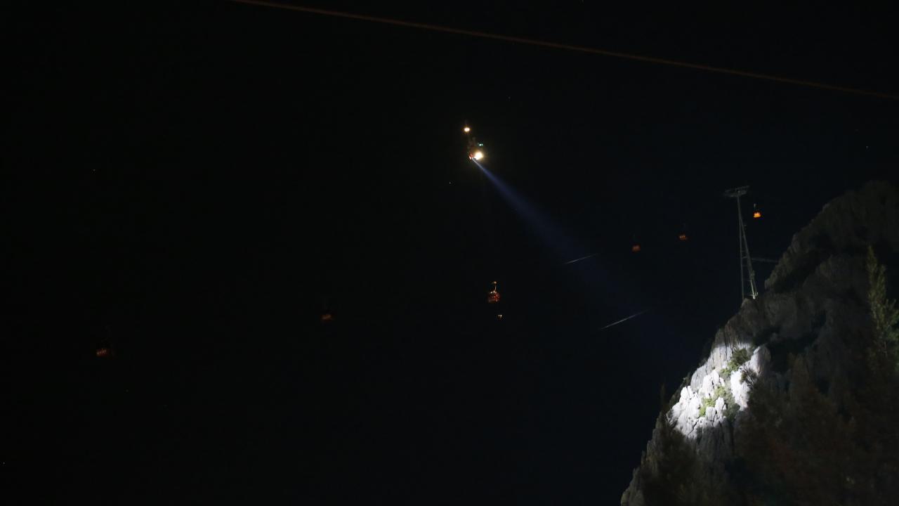 Antalya'nın Konyaaltı ilçesindeki Tünektepe Teleferik Tesisi'nde kaza nedeniyle kabinlerde mahsur kalanlar, gece görüşlü helikopterlerin yardımıyla kurtarılıyor.
