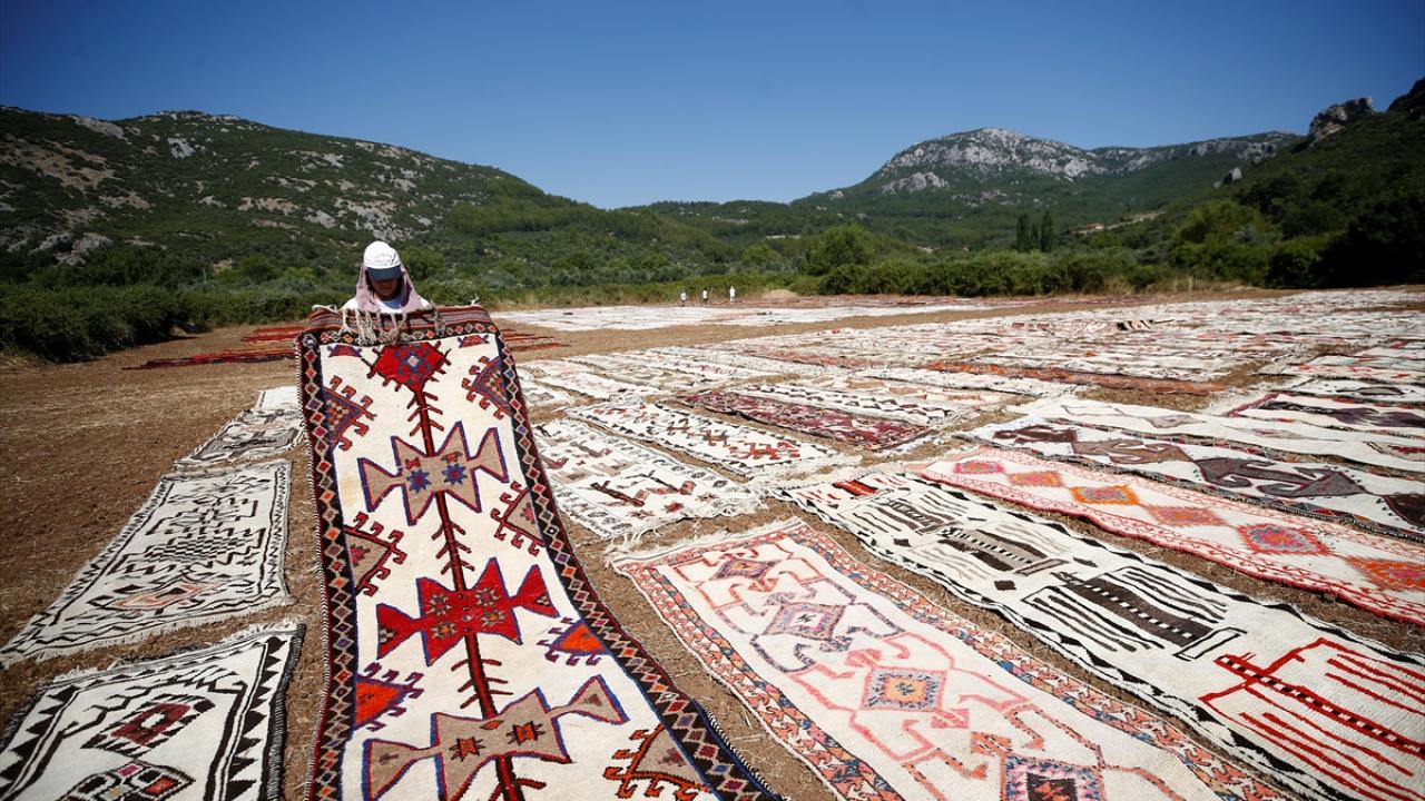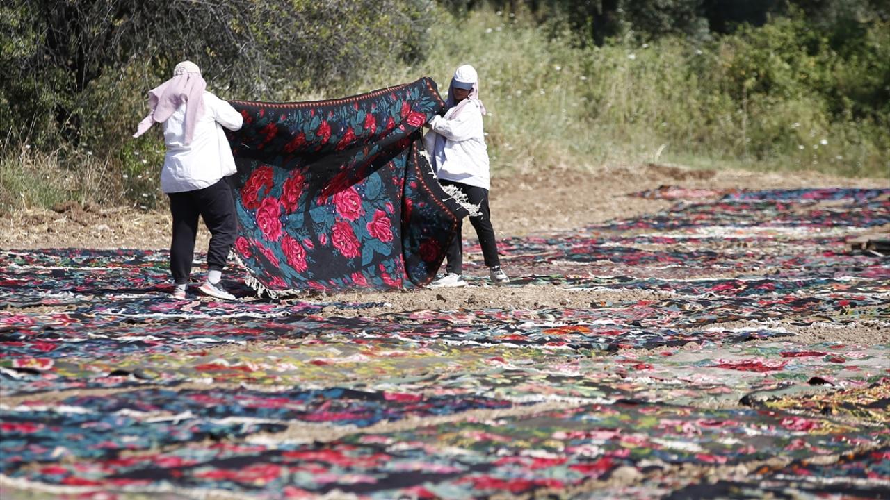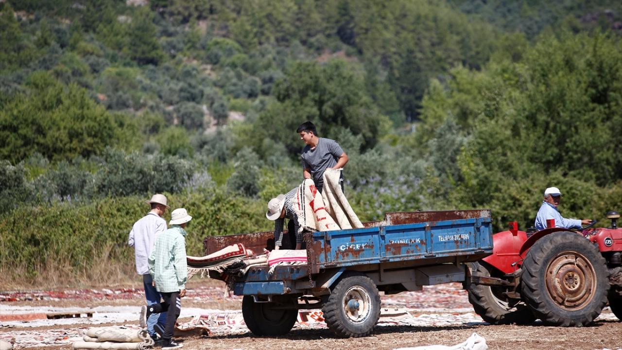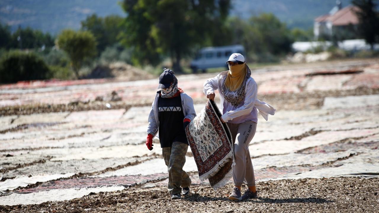 Halılar daha sonra güneş altında mikroplarından arınması ve renginin pastele dönüşmesi için tarlalara seriliyor. Ekin hasadı için tarlalarda günlerce alın teri döken işçiler, aynı tarlalarda bu kez halı mesaisi yapıyor.