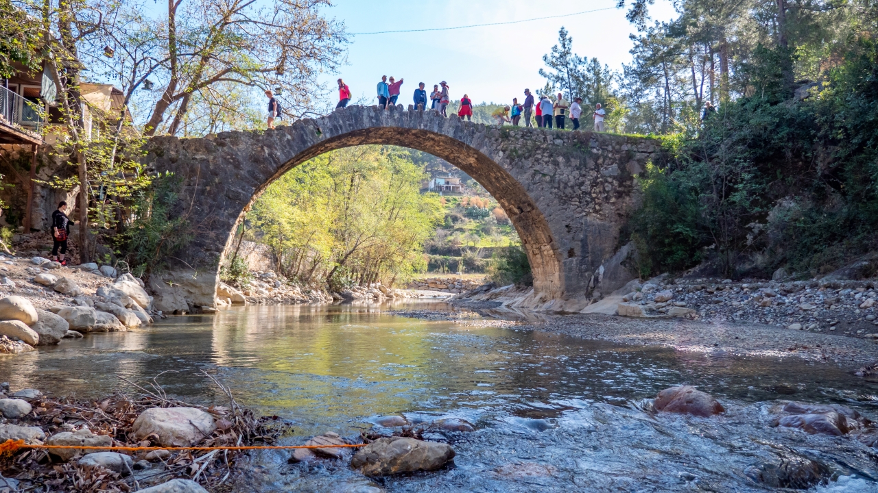 Bu yıl suyunda önemli ölçüde azalma gözlenen Kaşlıoğlu Köprüsü, doğasının güzelliği ve çevresinde yetişen mevsim çiçekleriyle ziyaretçilerine eşsiz görüntüler sunmaya devam ediyor.