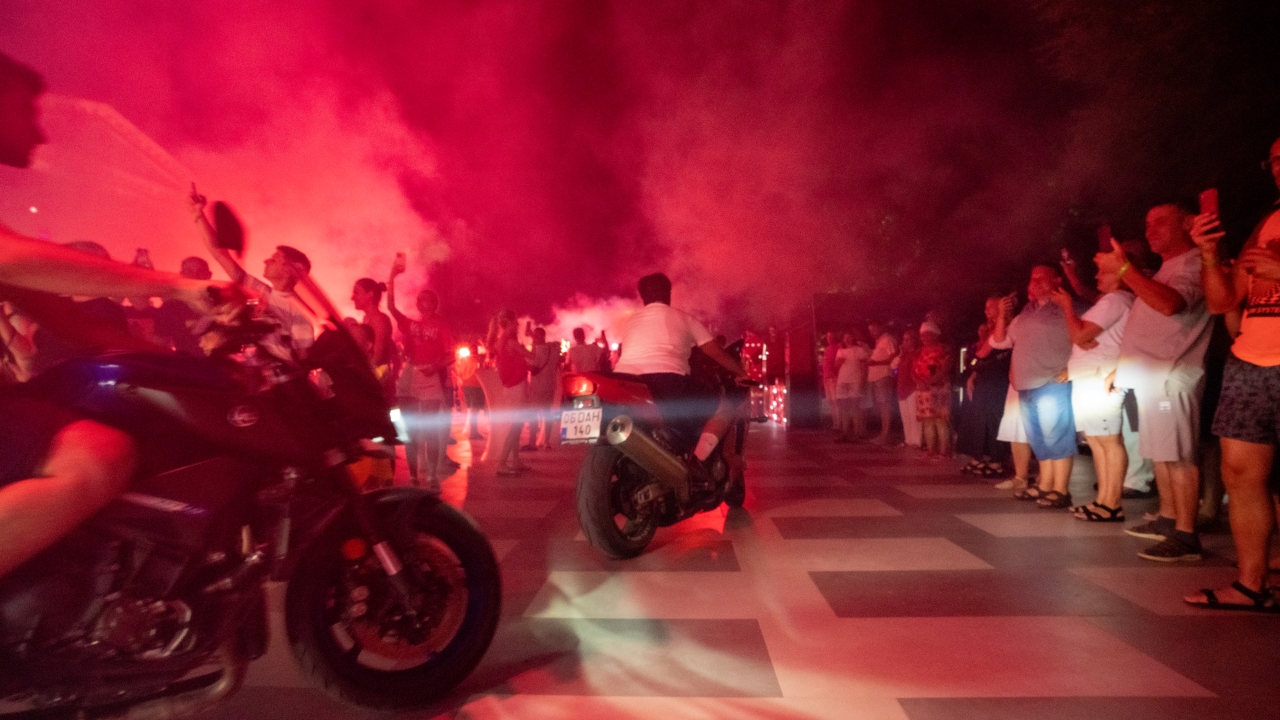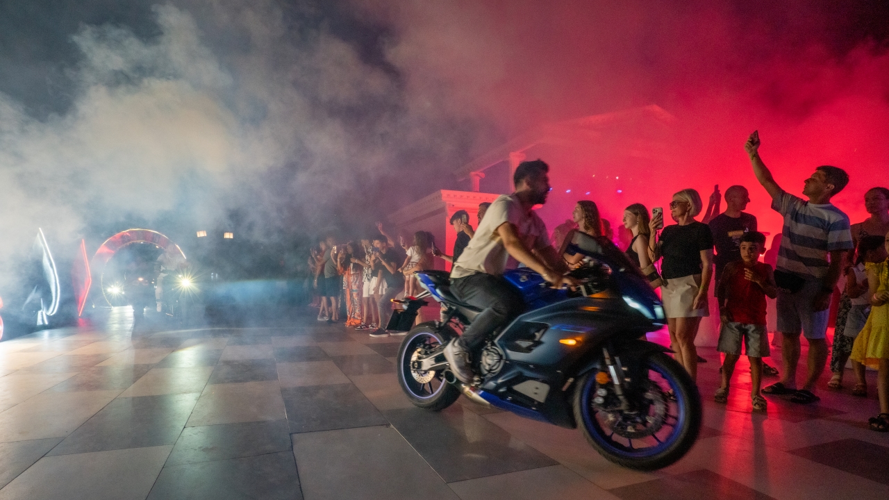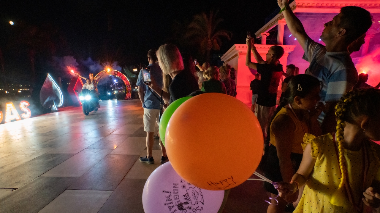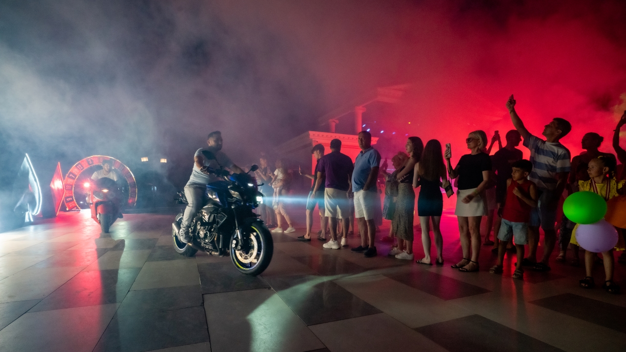 Özellikle çocukların büyük ilgi gösterdiği gösteride motosikletçiler havai fişeklerle sahneye geliyor.