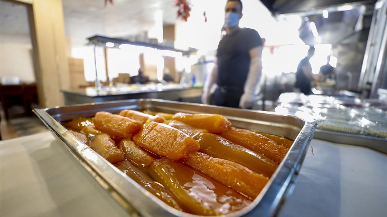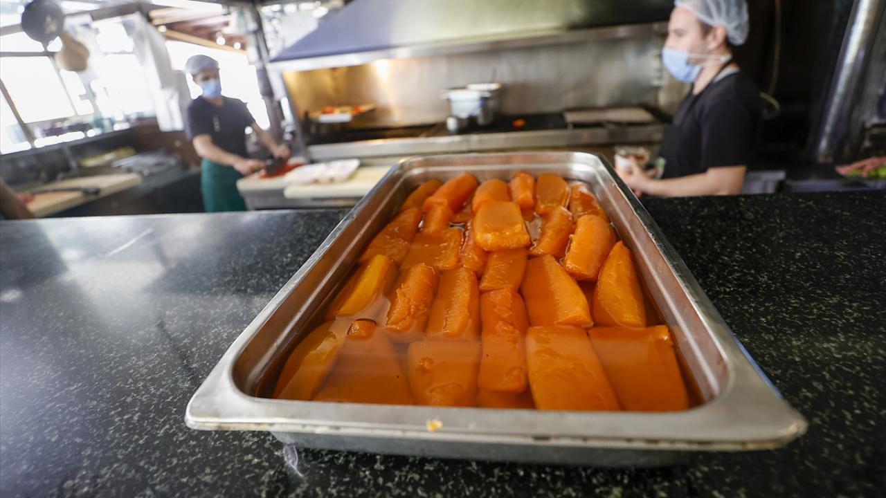 Soyulmuş bal kabağı dilimlerinin bir gün toz şekerde bekletilip, yaklaşık 2 saat ocakta pişirildiğini aktaran Çalışkan, "Kabaklar, tepsilerde kızartılması için kuzineye ya da fırına sürülüyor. Kızartılmış bal kabakları üzerine çifte kavrulmuş tahin dökülüp ve ceviz içi serpilerek servis ediliyor. İsteğe göre kaymaklı olarak da sunum yapılıyor." diye konuştu.