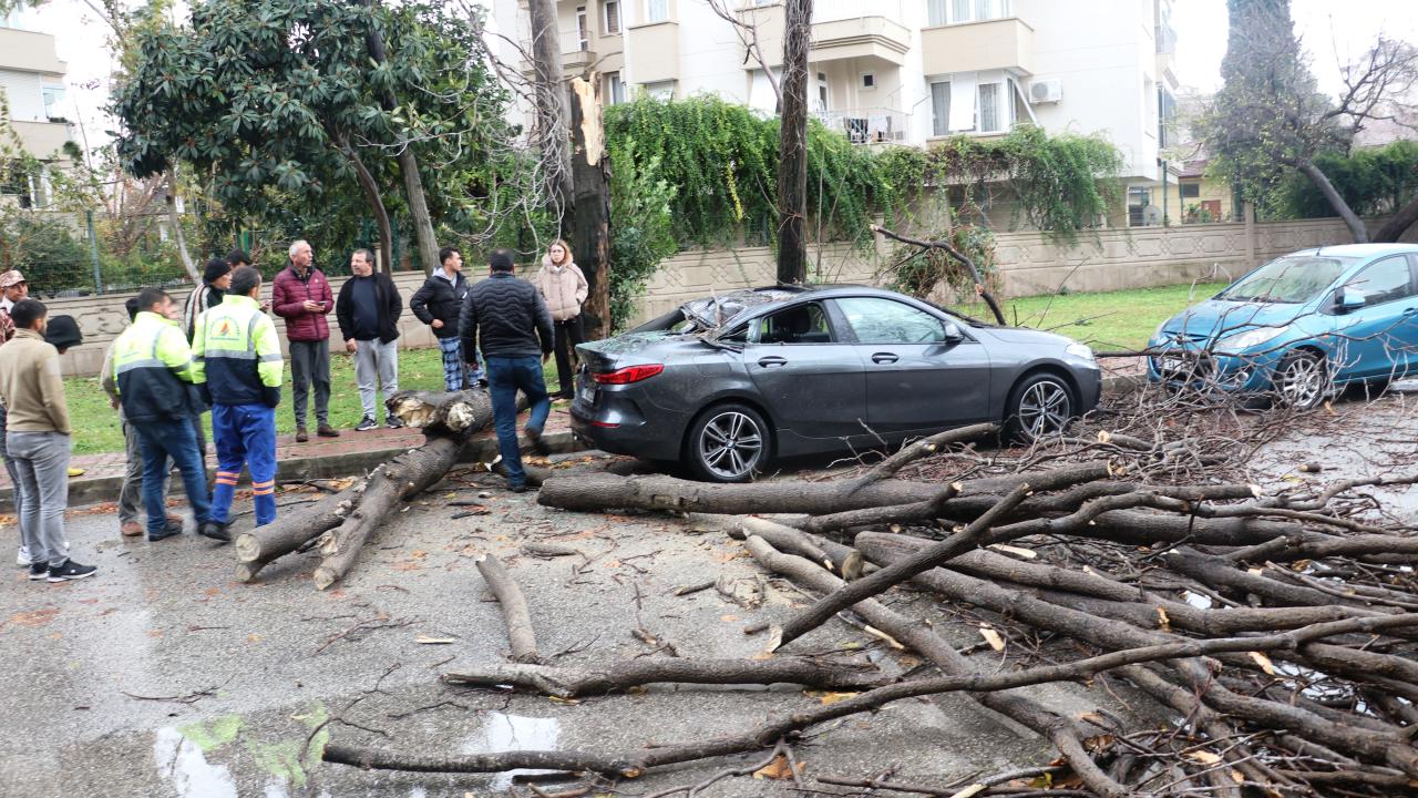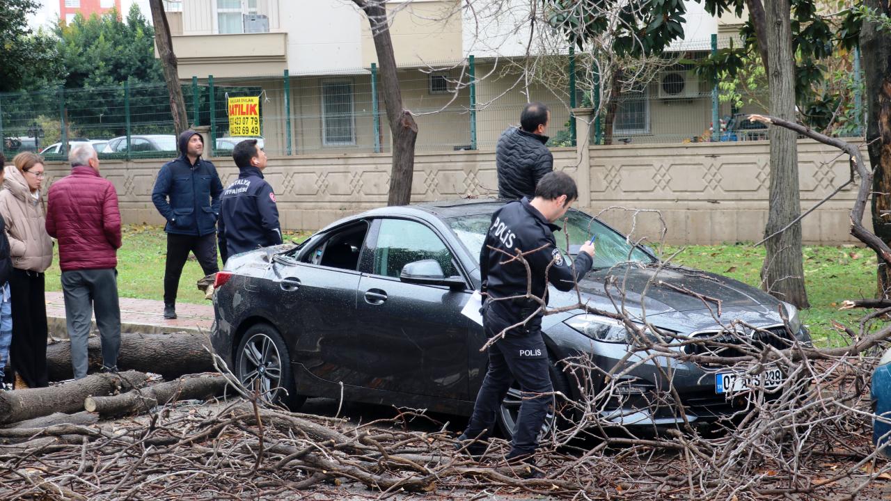 Antalya`da yağışla birlikte etkili olan fırtınada Muratpaşa ilçesi Meydankavağı Mahallesi`nde park halindeki otomobilin üzerine gövdesinden kırılan ağaç devrildi.