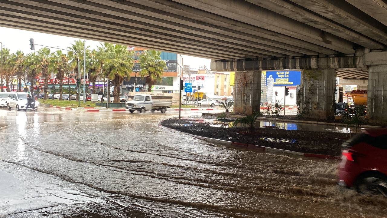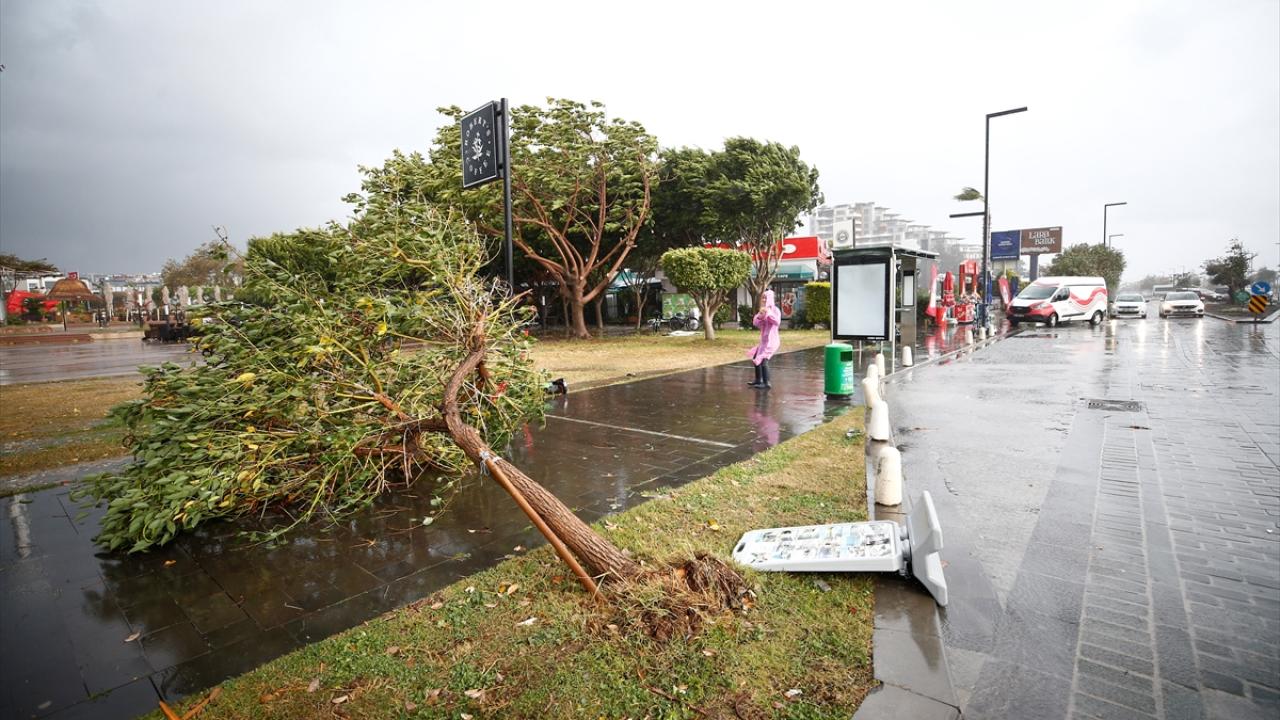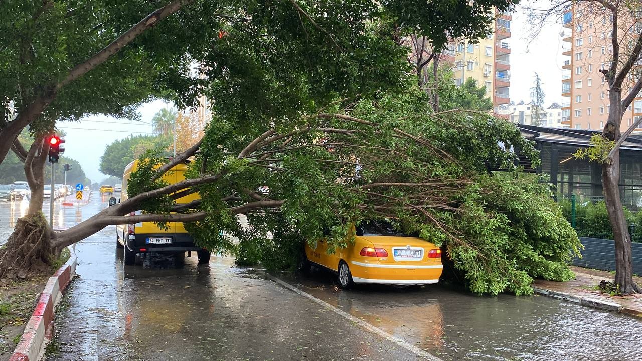 Antalya'da kuvvetli yağış ve fırtına hayatı olumsuz etkiledi. Şiddetli yağmur nedeniyle bazı araçlar yollarda ilerlemekte zorlanırken, fırtına ise bir çınar ağacını gövdesinden ayırdı.