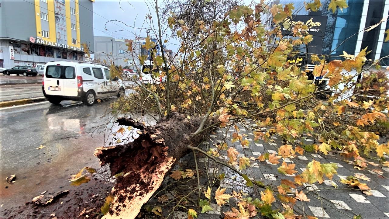 Kuvvetli rüzgar, kentin çeşitli noktalarında ağaçları devirdi, bazı araçların üzerine levhalar ve binalardan uçan panjurlar düştü.