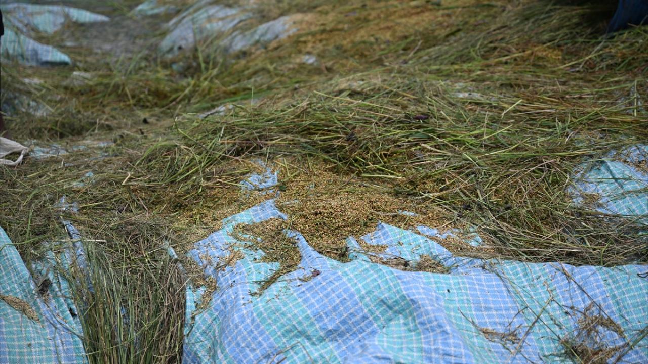 Sabahın erken saatlerinde tarlaya gelen işçiler, çeltiğin başaklarını orakla biçtikten sonra elleriyle topladıkları ürünü ayrıştırma alanına taşıyor.