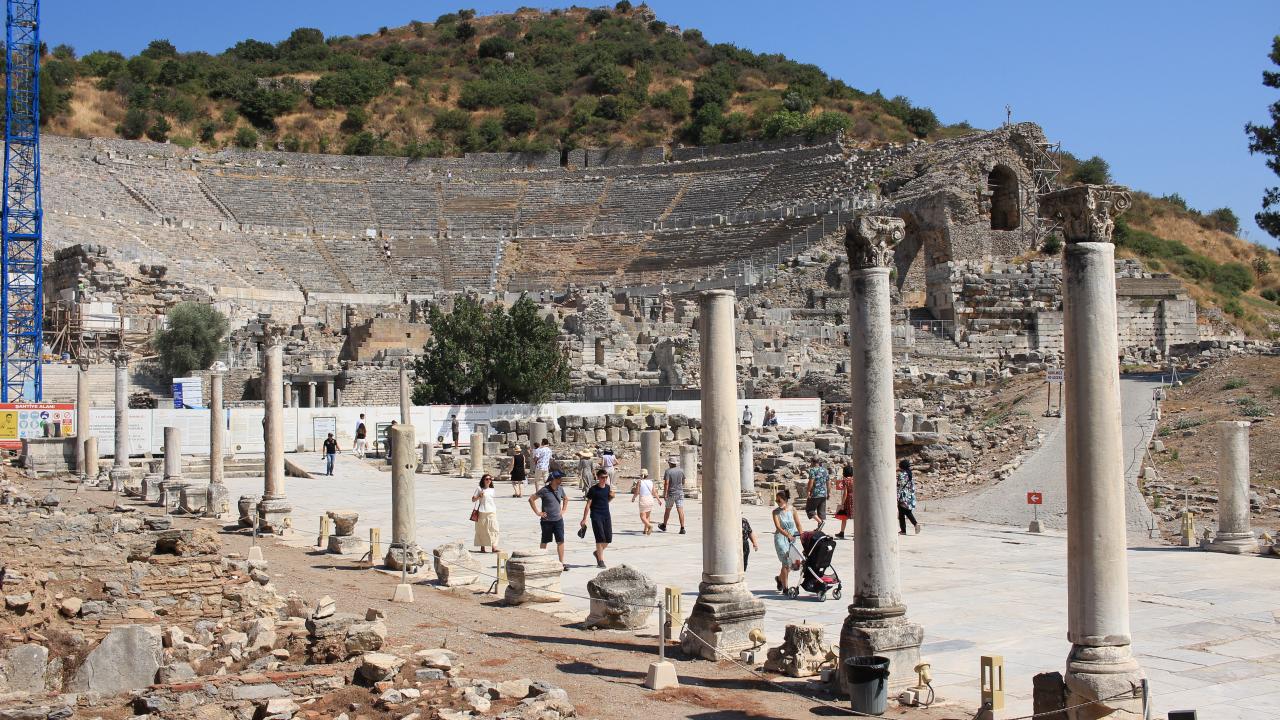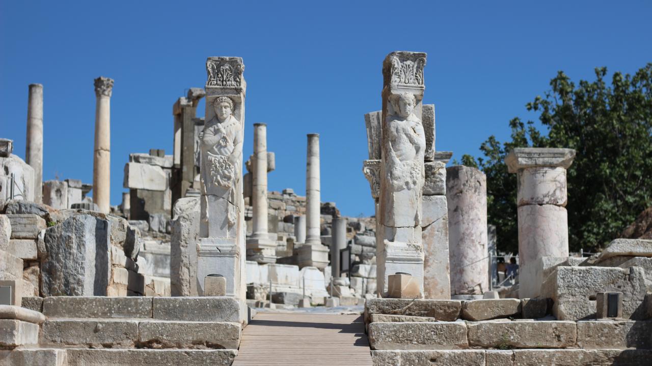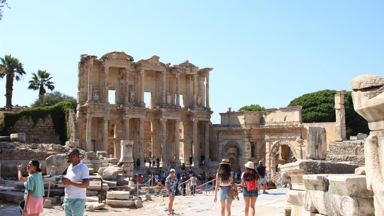 Efes Antik Kenti, Celsus kütüphanesi, antik tiyatro, yamaç evler ve önemli mimari eserleriyle yerli ve yabancı turistlerin ilgi odağı.