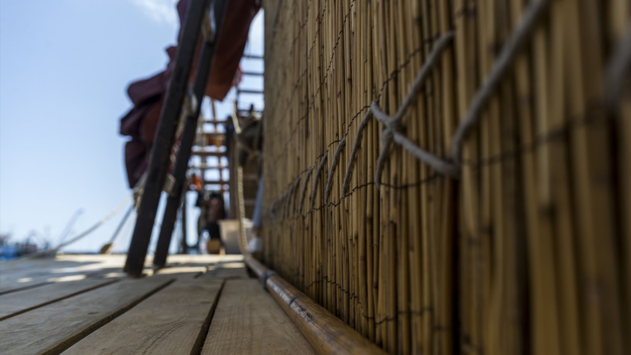 Ana güvertede inşa edilen kulübede mürettebatın kaldığı geminin yapımında 12 ton totora kamışı kullanıldı.