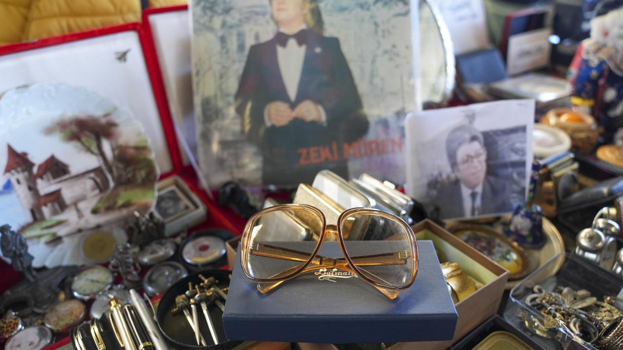 Farklı ürünlerin yer aldığı tezgahta, Türk sanat müziğinin unutulmaz isimlerinden besteci ve ses sanatçısı Zeki Müren`in katıldığı programda taktığını öne sürdüğü gözlük dikkati çekiyor.