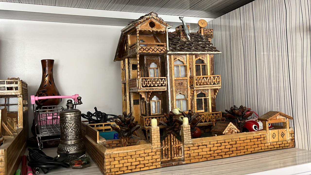 Antika ve yaptığı ahşap objeleri evinin bir odasında sergiliyor