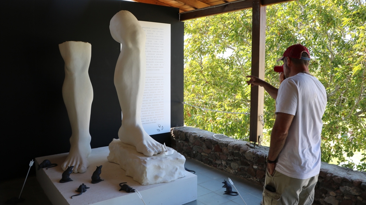 "Yunan mitolojisinde inanışa göre Apollon adlı tanrının bir heykelinin olması lazım ancak sol ayağının baldırla diz arasındaki bir parçası ele geçmişti. Önceki yıllarda başladığımız onarım ve yeniden canlandırma içeriğinde Apollon`un iki ayağını da yaptık. Ayakların nasıl böyle durduğunu belirledik. Apollon`a ait tapınakta bulunan Alexandra Troas sikkelerinde hem tapınağın resmi hem de Apollon`un fareyle olan ilişkisi var. Yani Apollon bazen sağ ayağıyla bazen sol ayağıyla farenin üzerine basıyor. Biz bu yıl Apollon`un iki ayağını ve fareleri yine mitolojik içerikli bir şekilde müzemizin önündeki terasta sergiledik. Daha önce fareleri tapınağın merdivenlerine monte etmiştik, bu iki ayakla da mitolojik bölümü tamamladık."