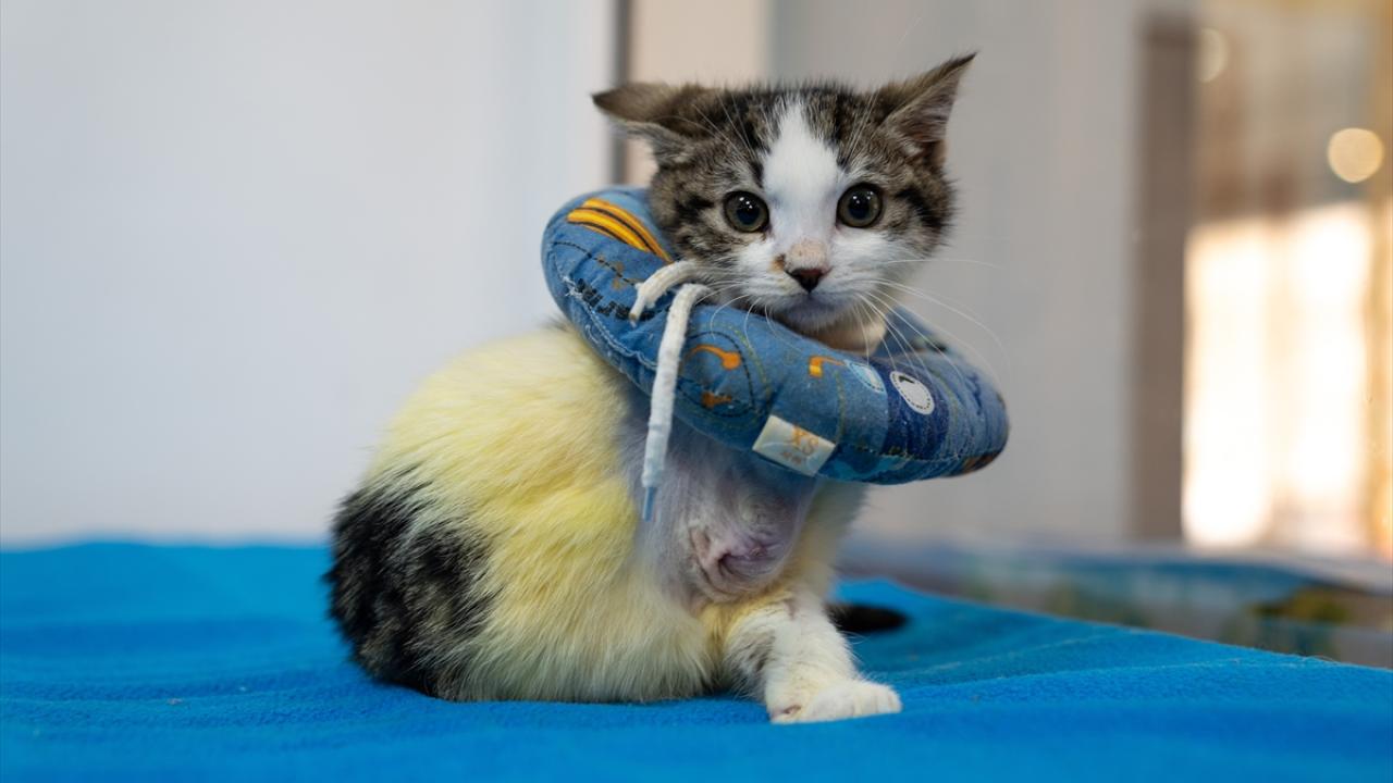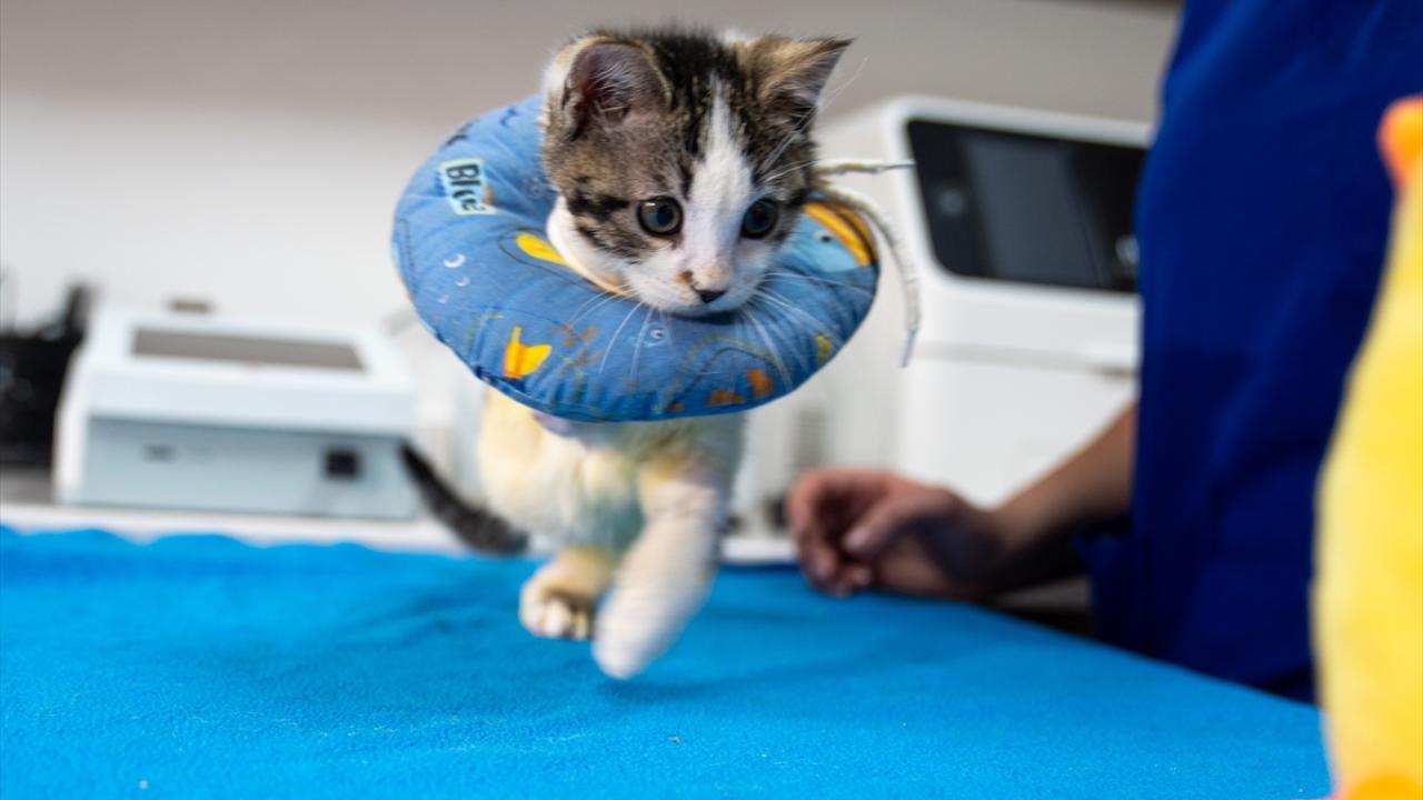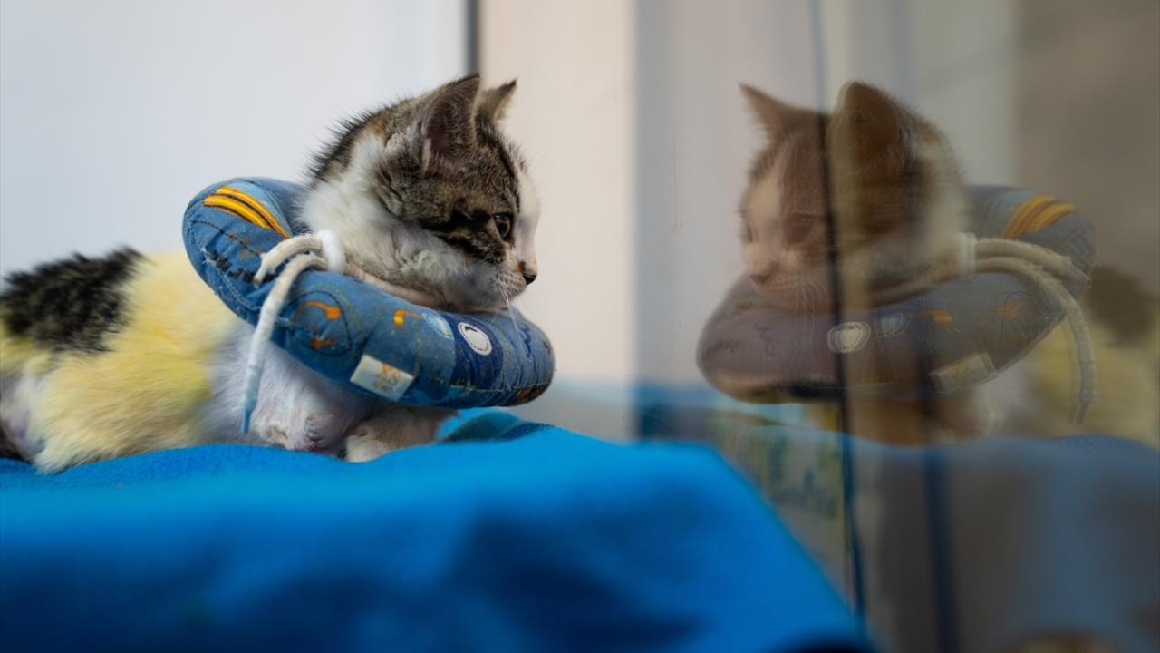 Sokaktaki bir aracın kaputunda sıkışmış halde ağır yaralı bulunan yavru kedi, veteriner hekimlerin bakımı ve sevgisiyle hayata döndü.