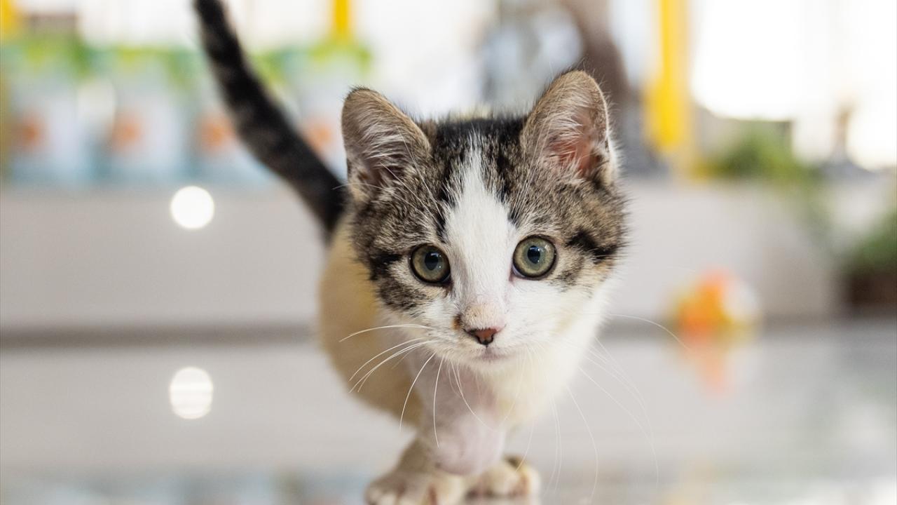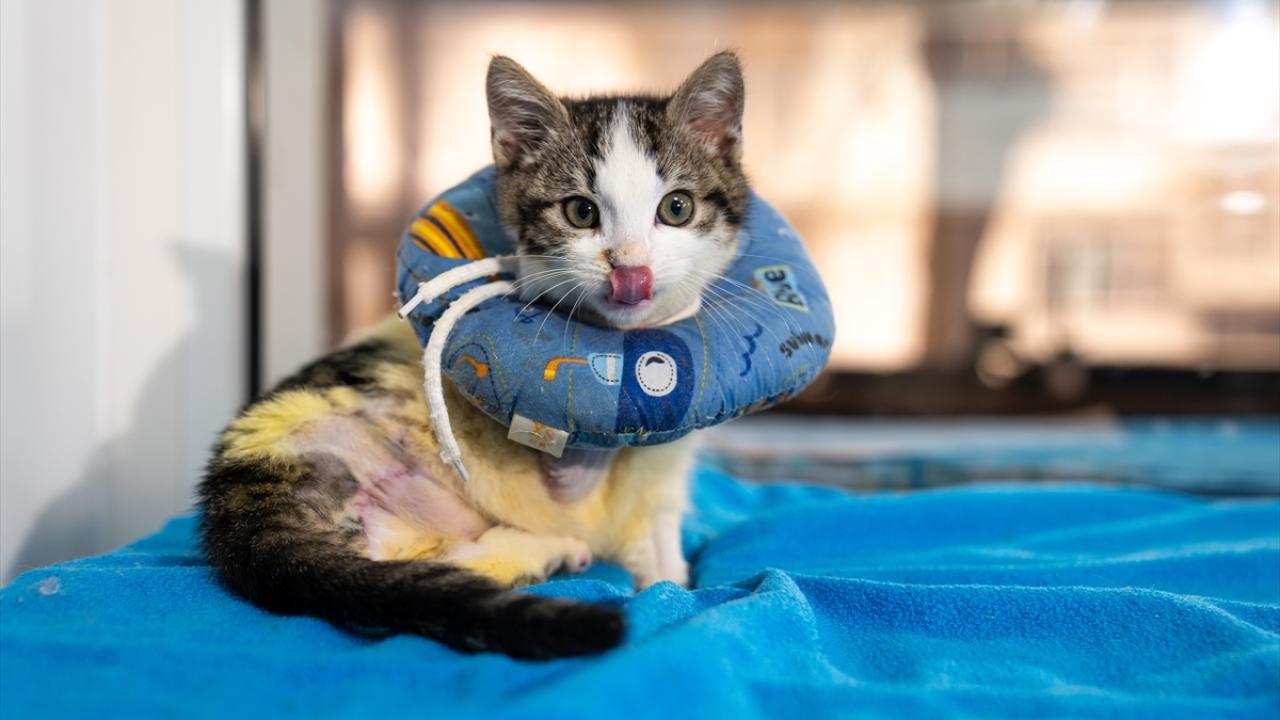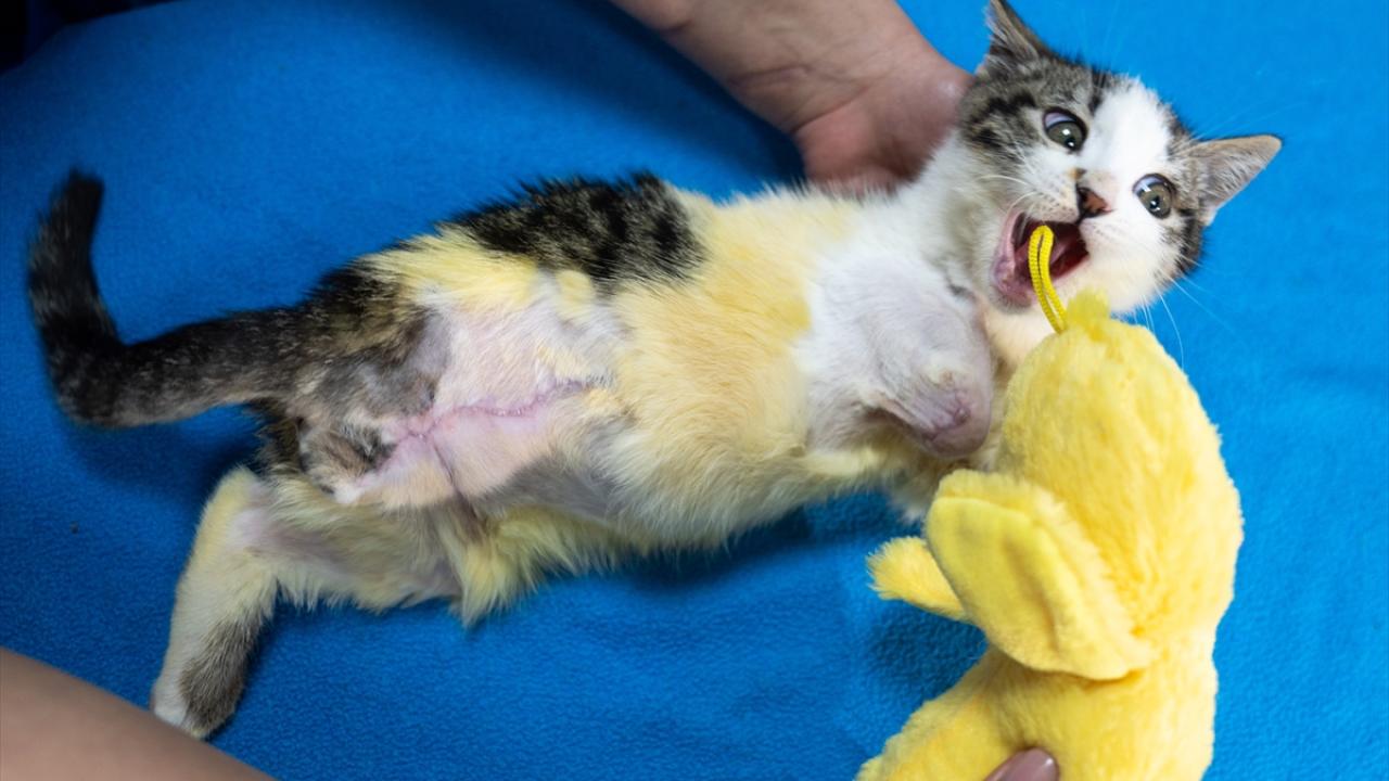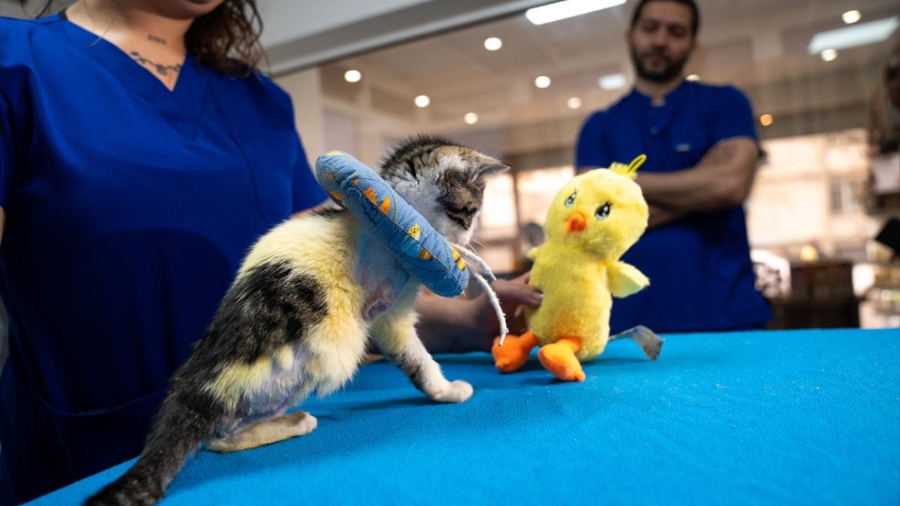 Sokaktaki bir aracın kaputunda sıkışmış halde ağır yaralı bulunan yavru kedi, veteriner hekimlerin bakımı ve sevgisiyle hayata döndü.