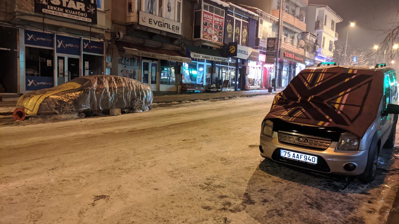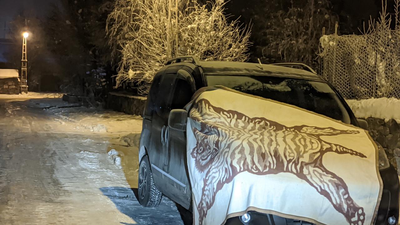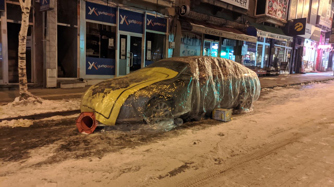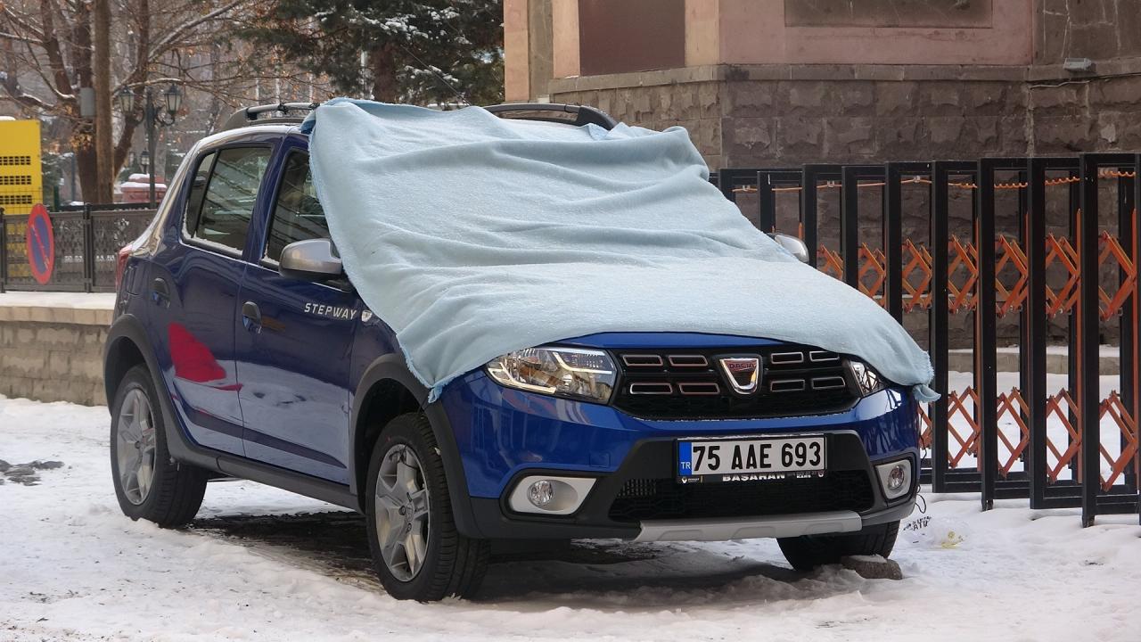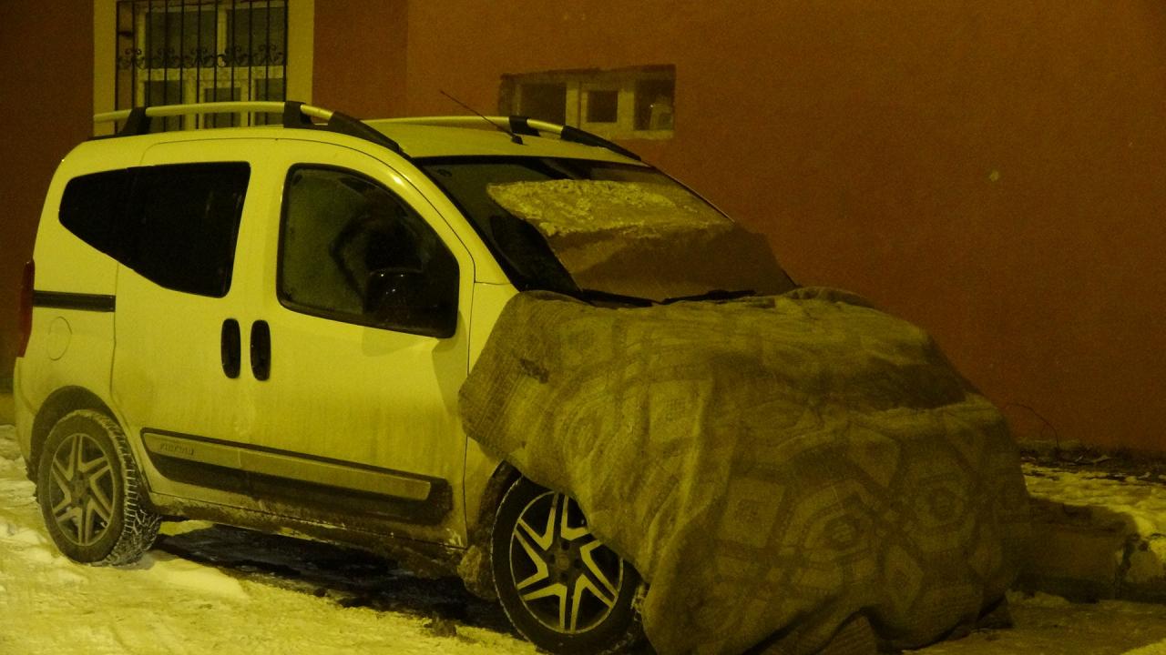 Vatandaşlar, dondurucu soğuktan etkilenmemesi için araçlarının üzerine naylon ve battaniye kapatıyor.