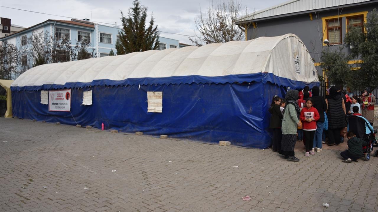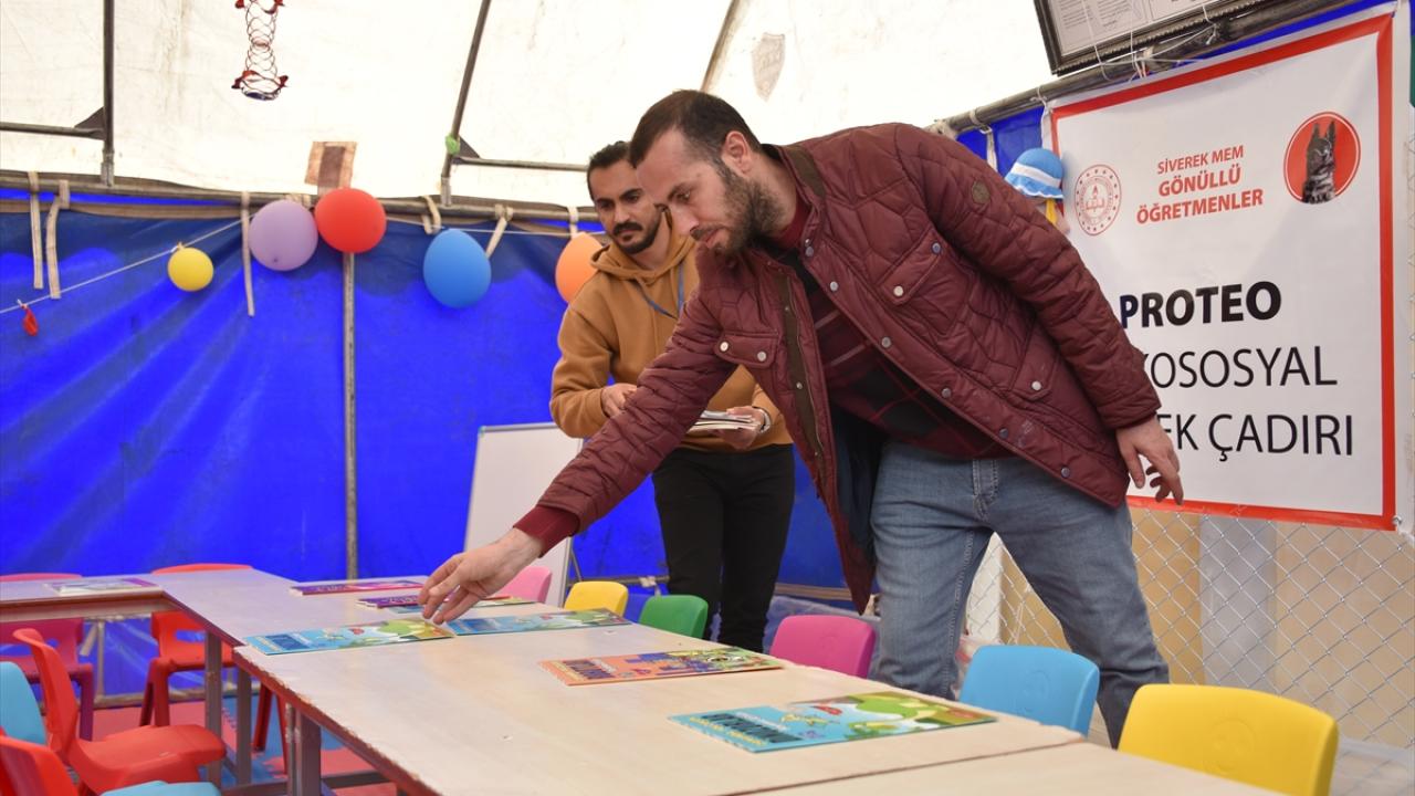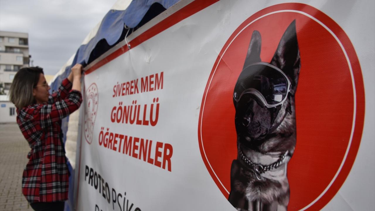 Öğretmenler, depremlerin ardından Meksika`dan Adıyaman`a gelen arama kurtarma ekibinin ölen köpeği Proteo`nun ismini verdikleri çadıra fotoğrafını da astı.