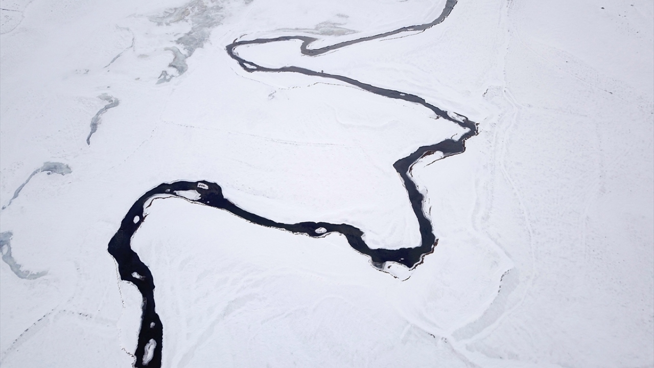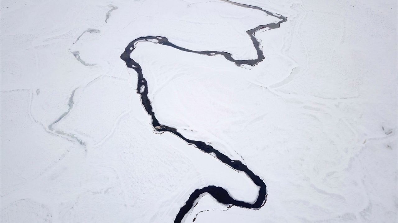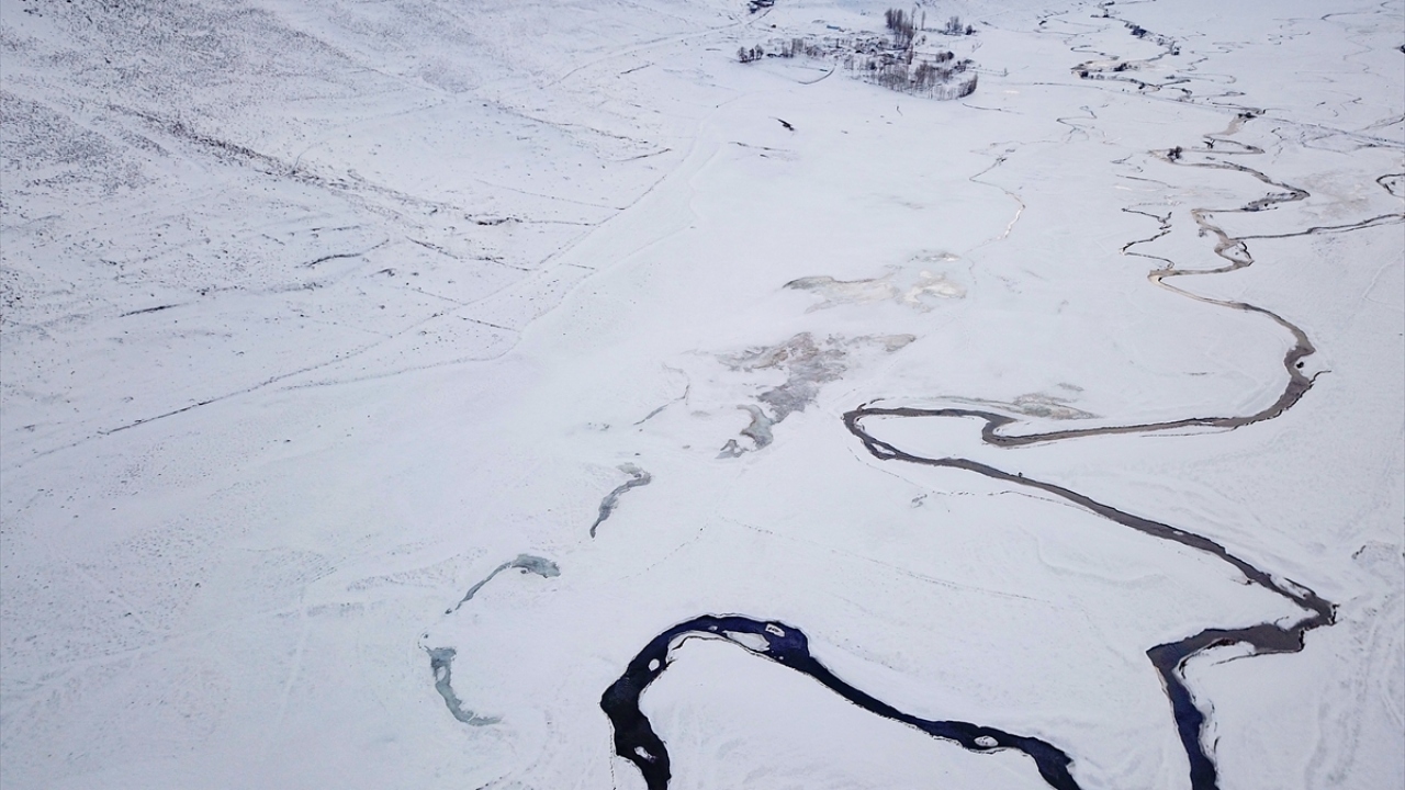 Iğdır'ın Tuzluca ilçesindeki Aras Dağları'nda bulunan Ünlendi Vadisi, bölgede etkili olan kar yağışının ardından beyaza büründü.