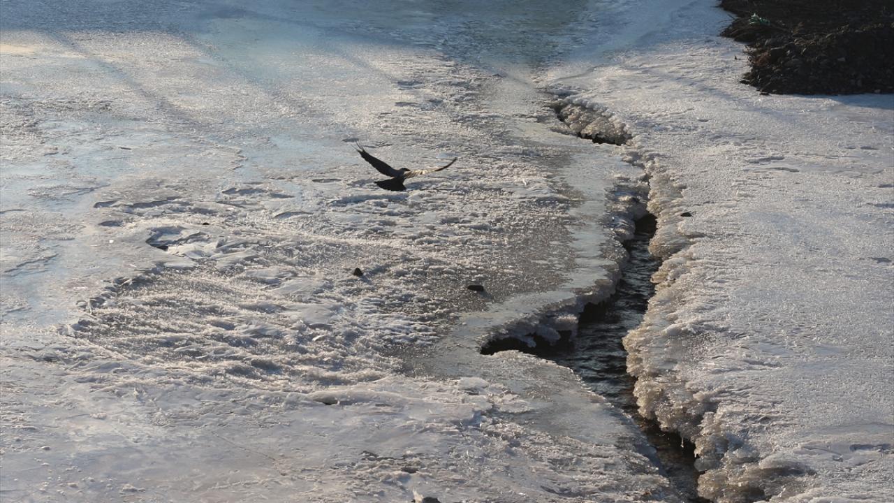 Erzurum'un Horasan ilçesinden geçen Aras Nehri'nin büyük bölümü buzla kaplandı.