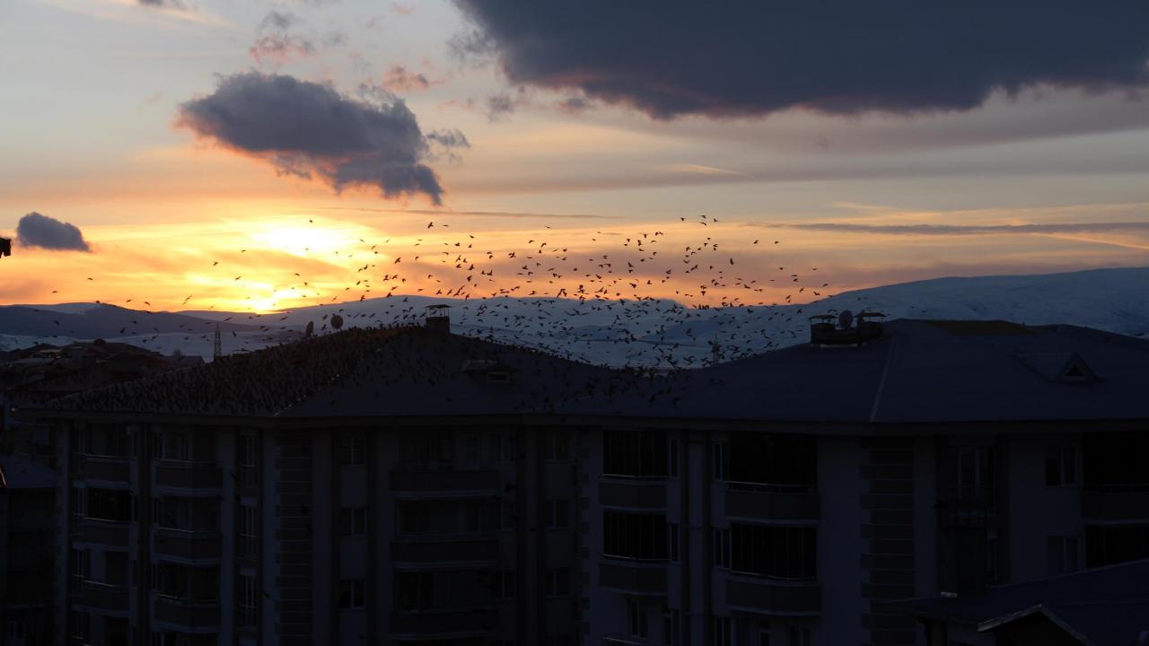 Güneşin battığı anlarda ortaya çıkan binlerce karganın birlikte uçtuğu anlar, ilginç görüntüler oluşturuyor.